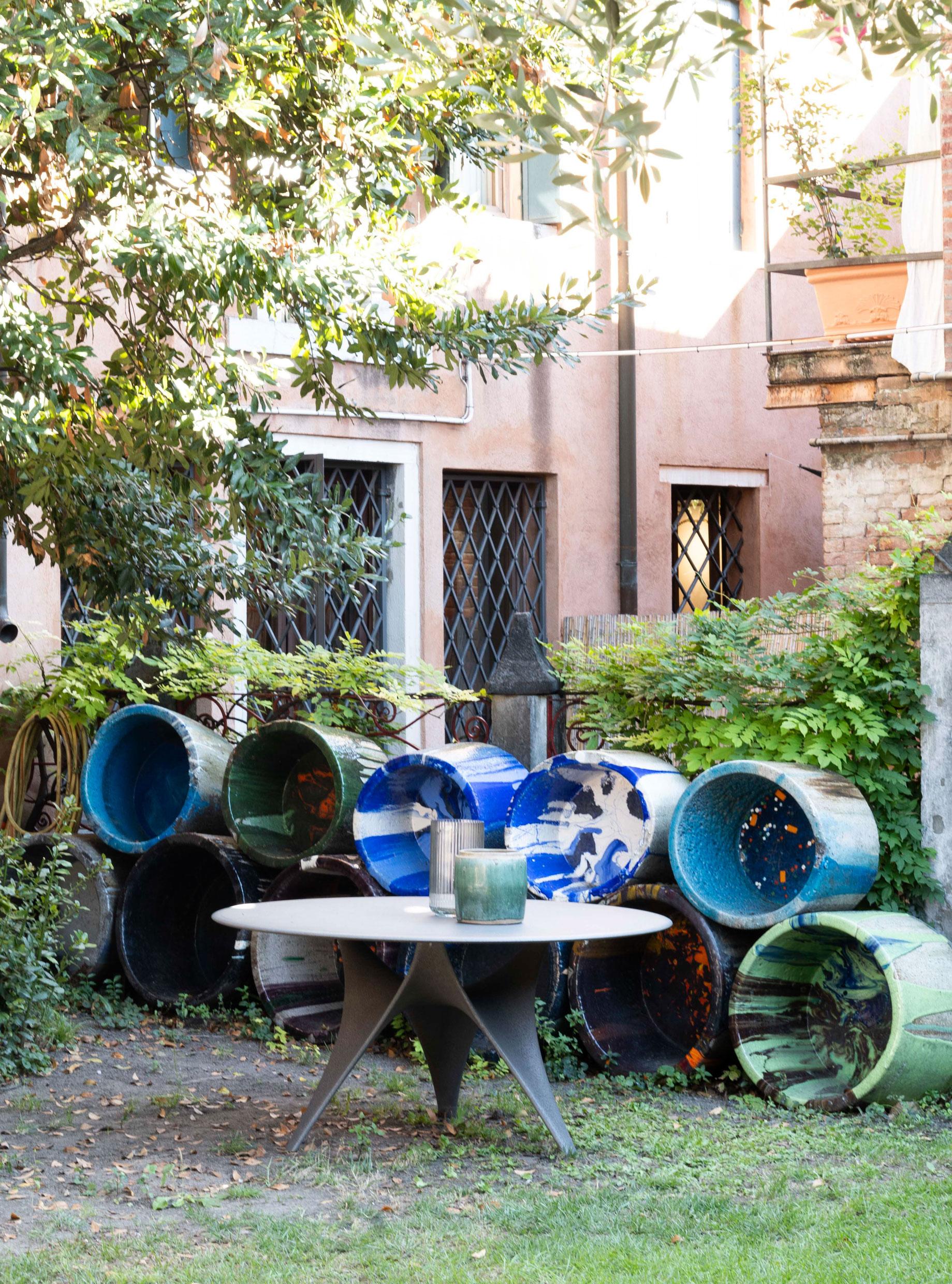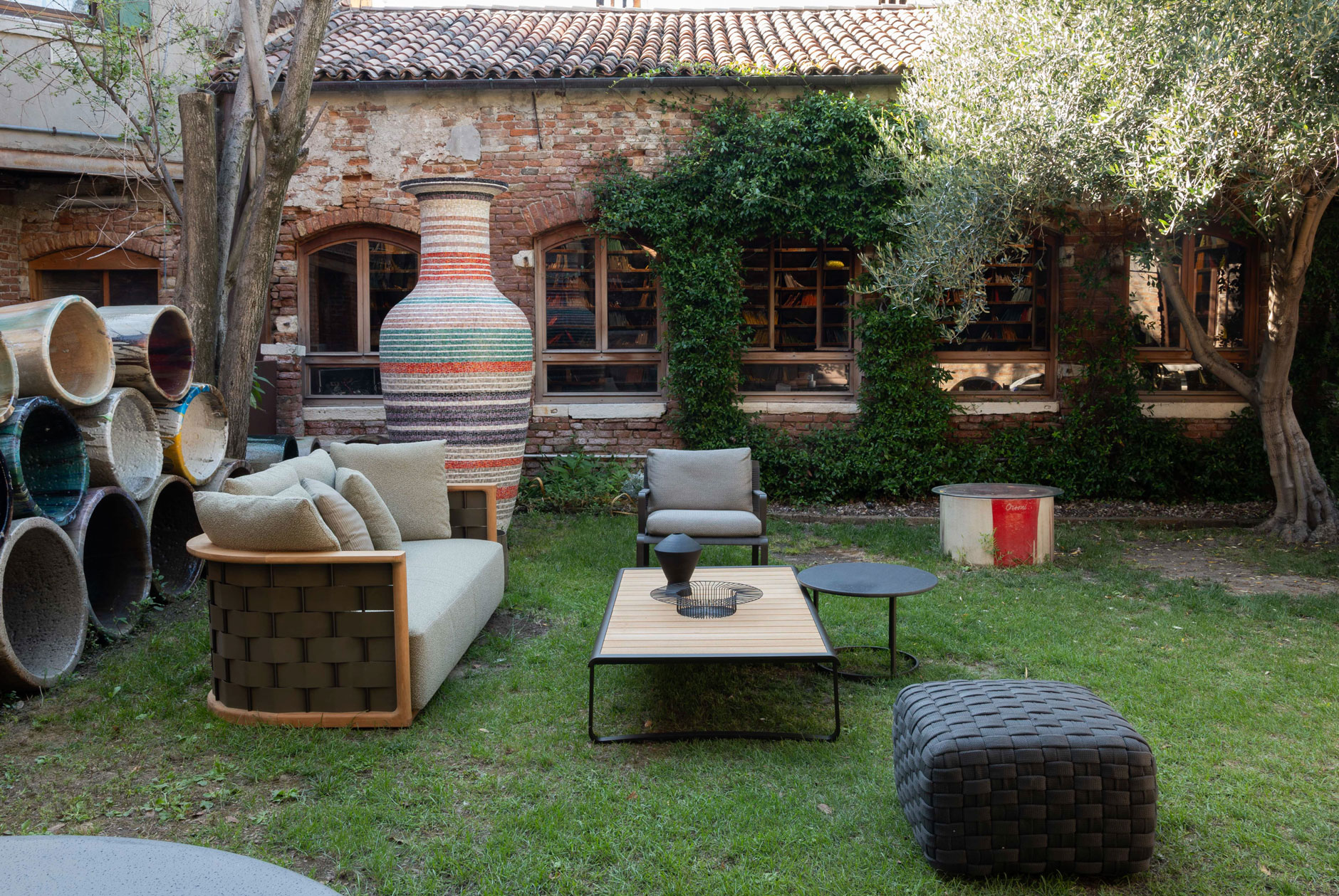 The Orsoni Venezia courtyard served as the backdrop for the Molteni&C's Outdoor Collection. Here, the elegance of the Palinfrasca sofa, Regent, and Aster small tables danced in perfect harmony with the outdoor ambience that features the heart of the furnace itself: the 'crogiolo,' which melds glass and color at high temperatures to create Venetian glass enamels.