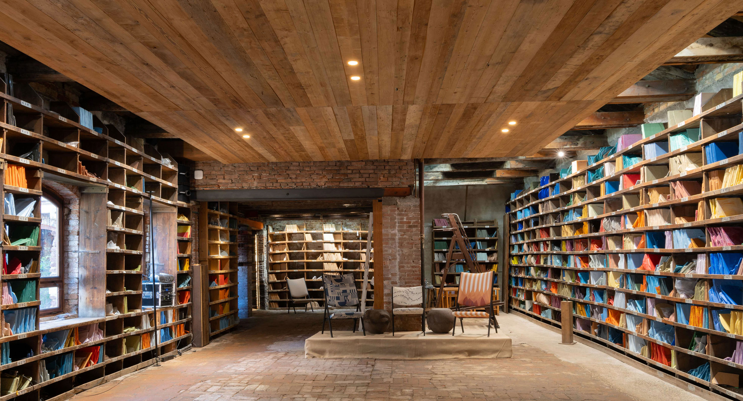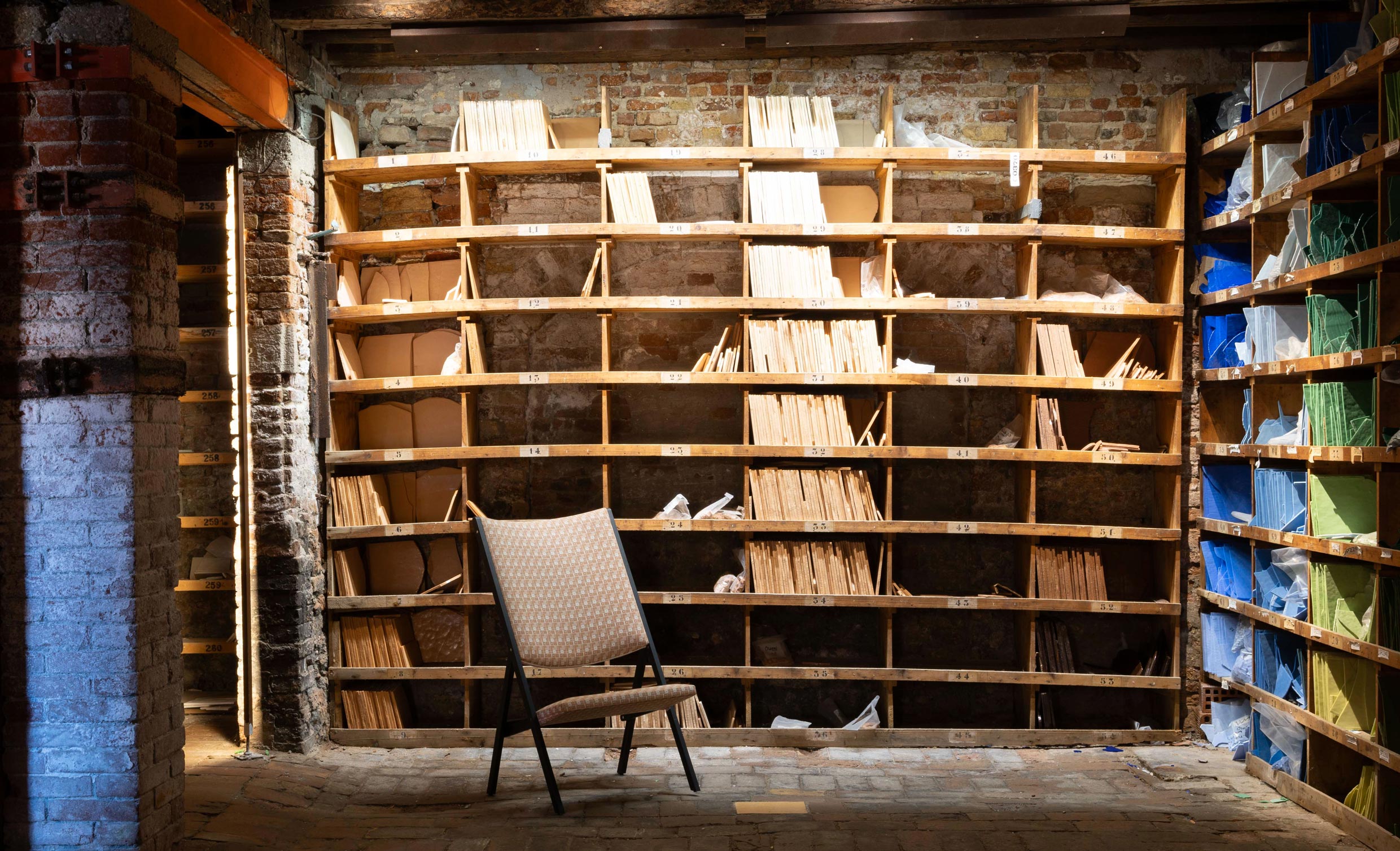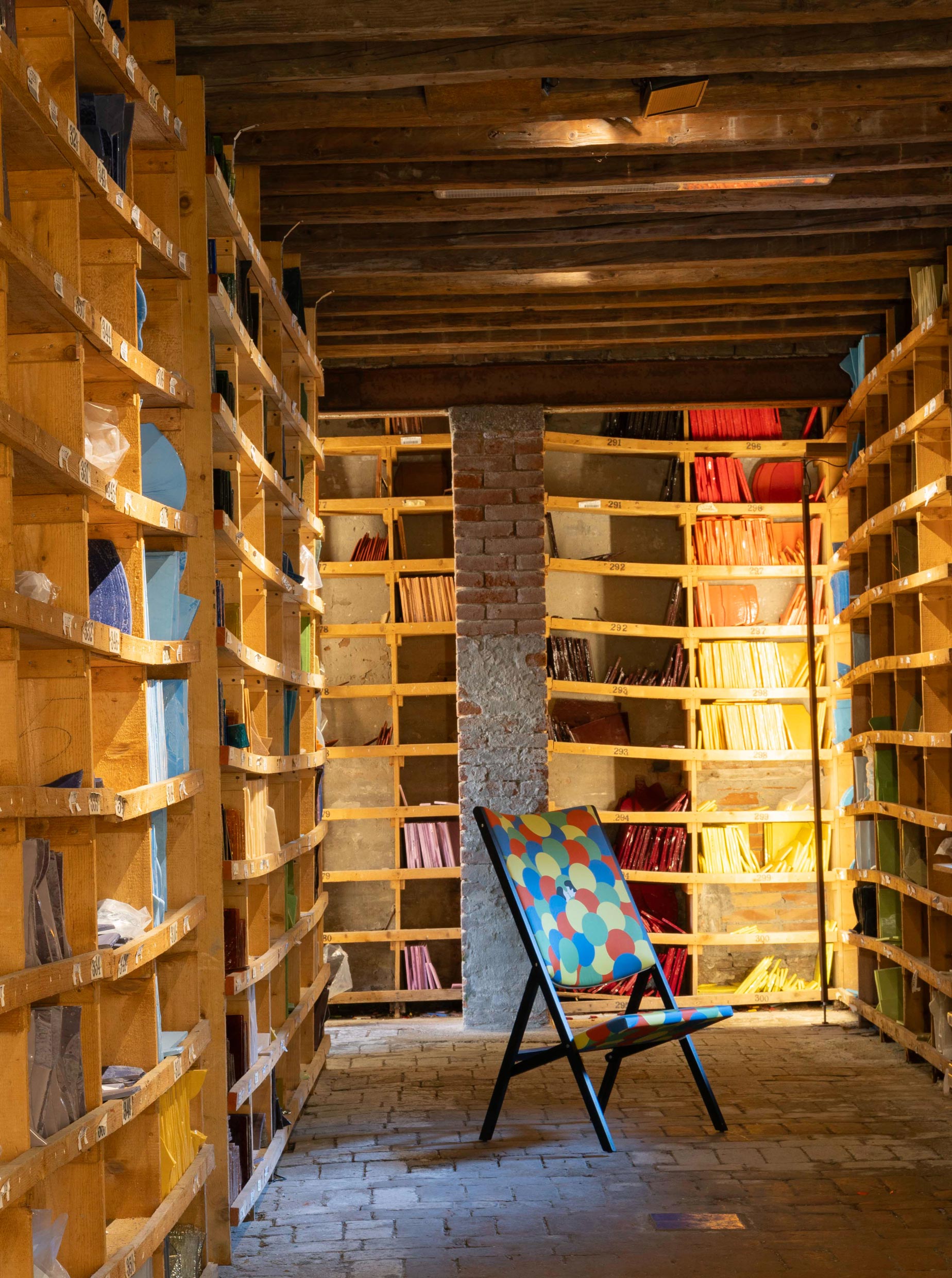 Another exclusive Gio Ponti design, the D.270.2 chair, took center stage in the Color Library, where Orsoni Venezia catalogs all the colors of the world, preserving them in a wooden library with expansive shelves akin to safeguarding precious books, ensuring that not a single hue is lost.