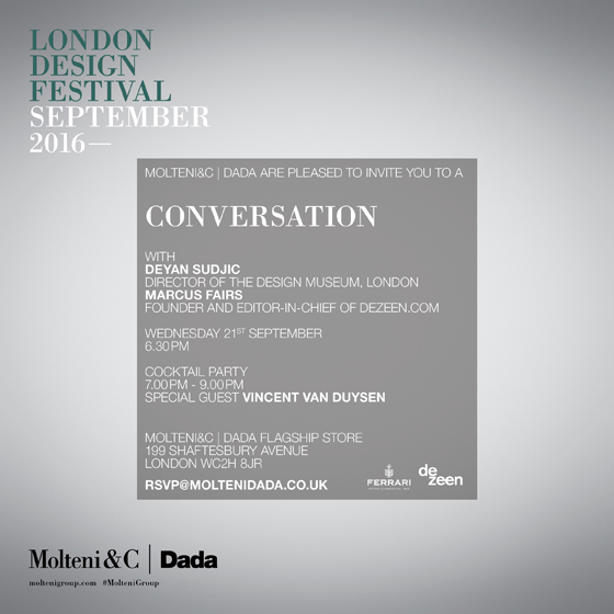 During the London Design Festival 2016, Molteni&C | Dada will present for the first time at the Flagship store in Shaftesbury Avenue, creations not only by the Belgian designer Vincent Van Duysen, like the new modular sofa Paul, the Madia Quinten and the coffee tables Jan but also projects by some of the most important contemporary designers like Michele de Lucchi and his desk Secretello and Jasper Morrison and his home office Ink. A new set-up designed by Van Duysen himself will bring back the refined atmosphere of the last Salone del Mobile held in Milan.