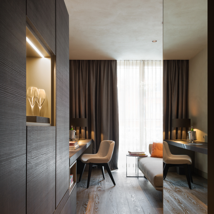 For this project Molteni&C Contract Division furnished all the social areas (lobbies, restaurants, bars), bedrooms and suites with custom made fixed and loose furniture charachterized by delicate nuances and completed by a curated collection of objets d’art. That reinforce the impression of staying at a private residence—albeit one outfitted with impeccable taste.