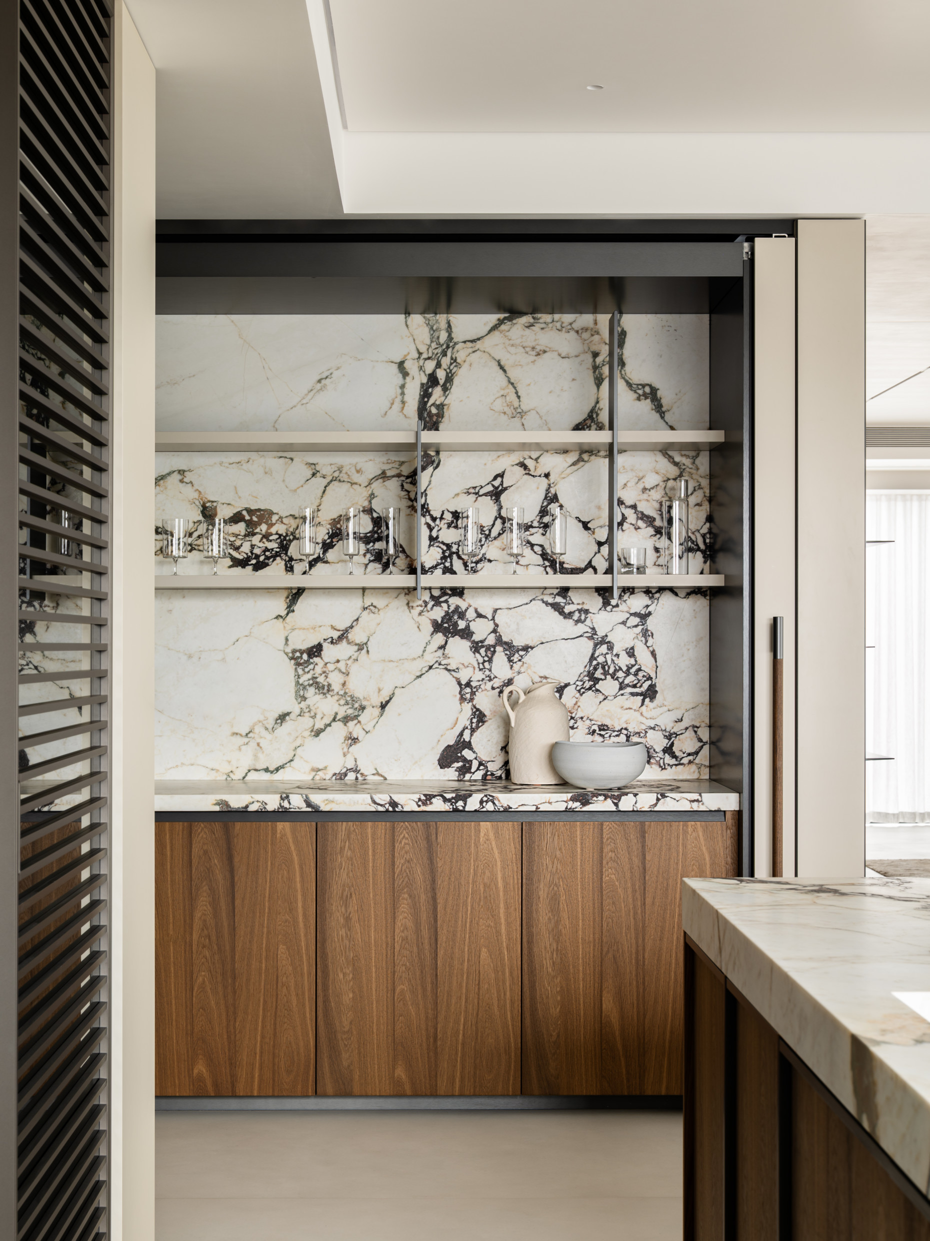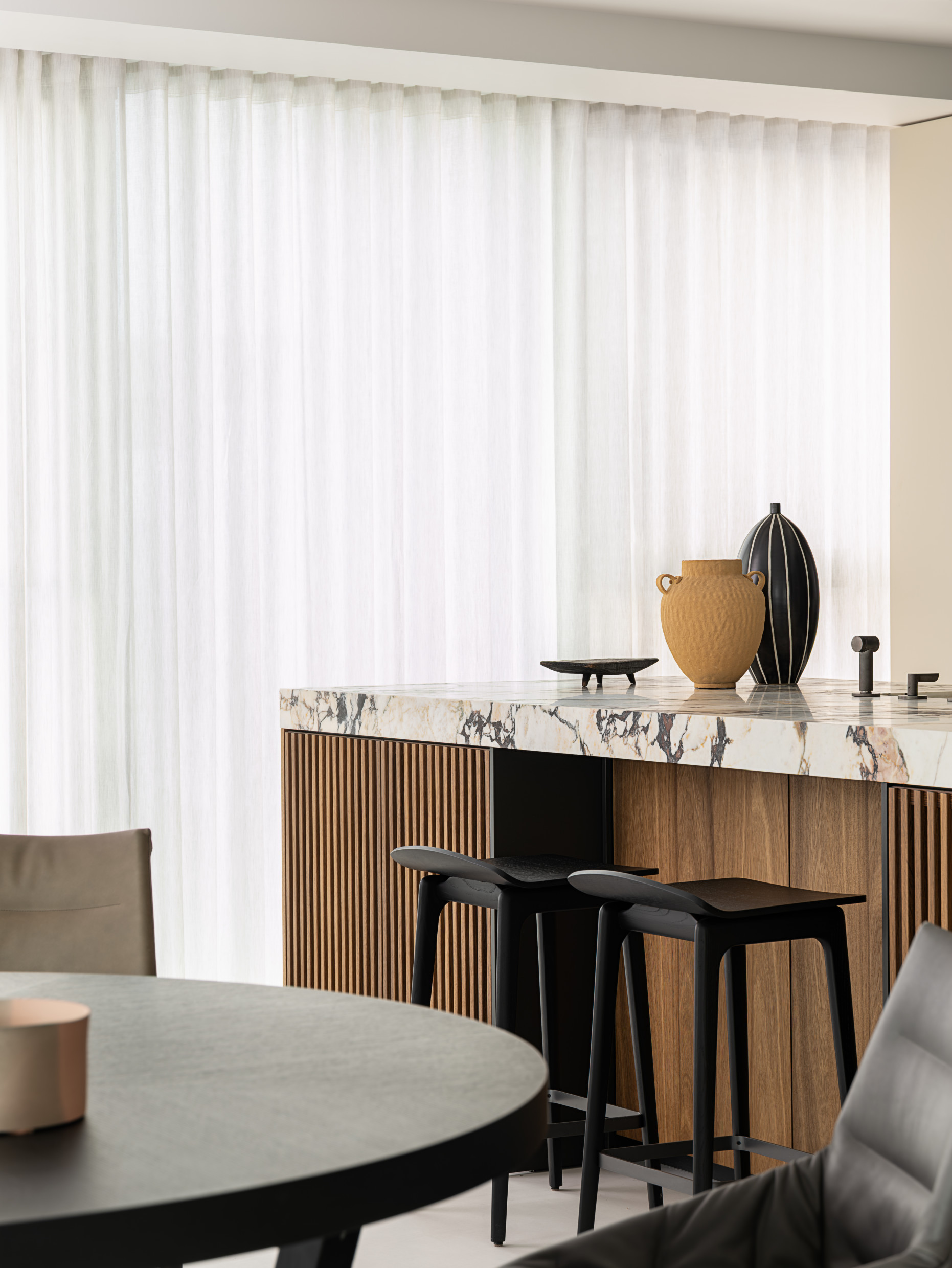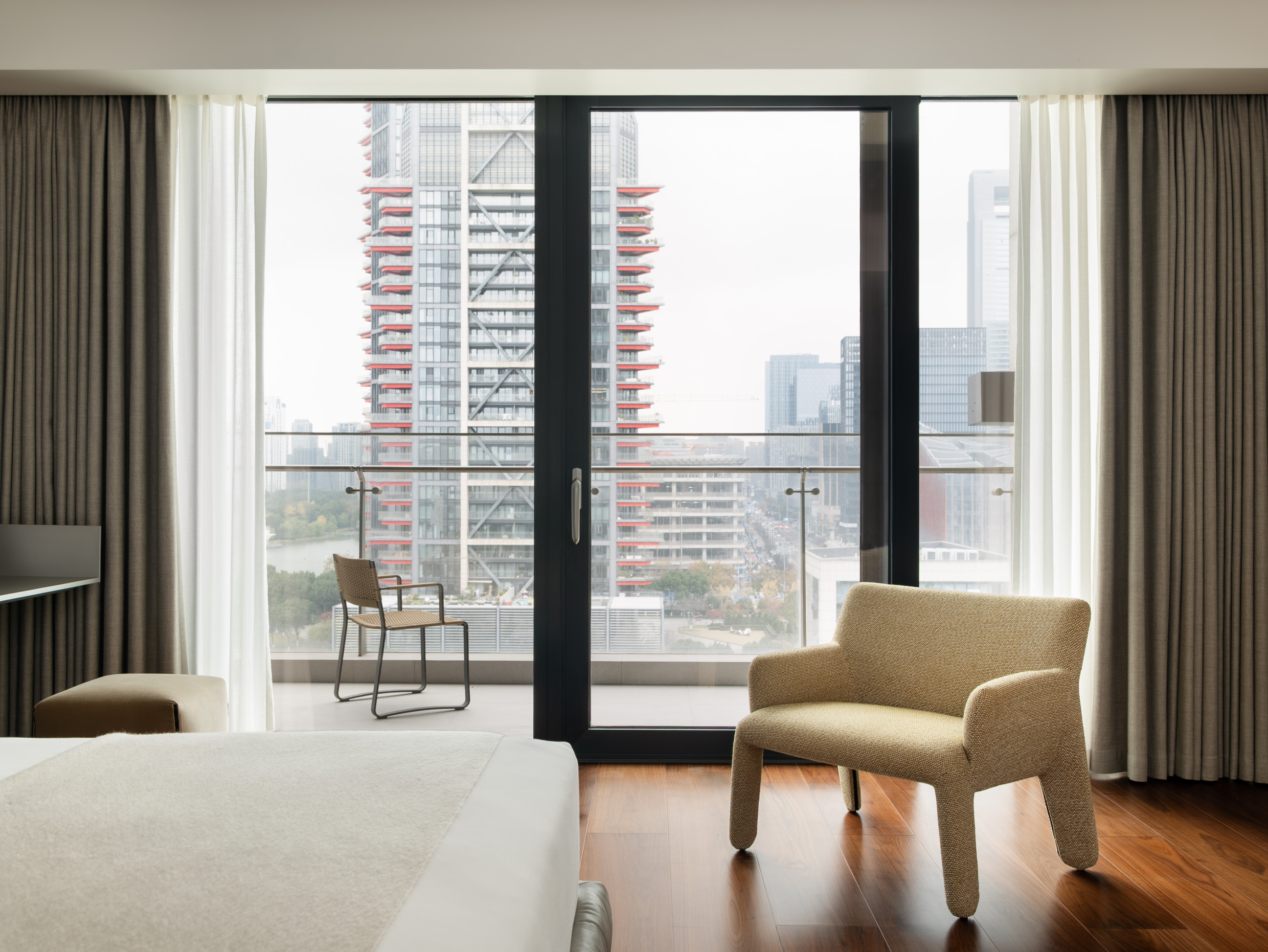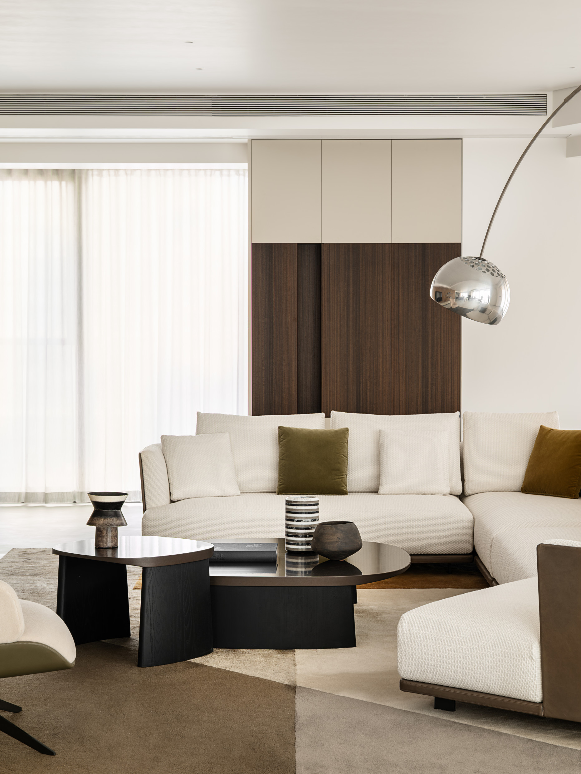 In the living room, the Cleo sofa and Cleo coffee tables by Vincent Van Duysen create a seamless synergy with the building’s exterior and the upscale character of the Yinzhou District.​ The modular sofa offers endless possibilities and is easily arranged around the coffee table, a domestic sculpture crafted from Eucalyptus, Black Oak and Sunrise Oak, encapsulating Van Duysen's meticulous attention to detail. The Arial boiserie by Studio Klass serves as an elegant backdrop for the entire space.