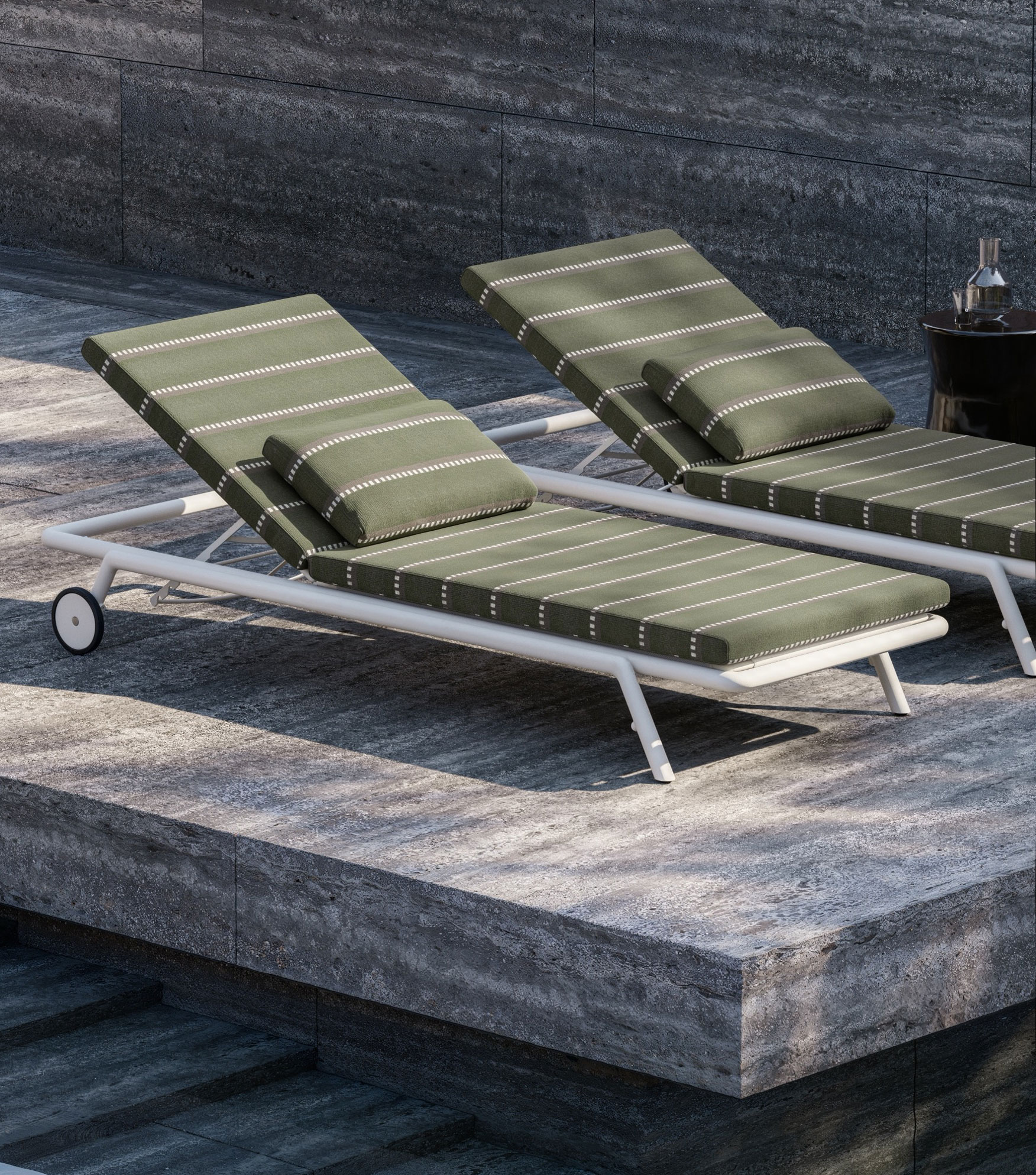 靠背选用亚麻色 Batyline 材质匠心打造,质感独具一格。这种材质兼具柔韧性、透气性和耐用性,格外适合户外环境。靠垫可自由摆放,自然贴合不同的躺卧姿势,为户外生活空间打造舒适体验。