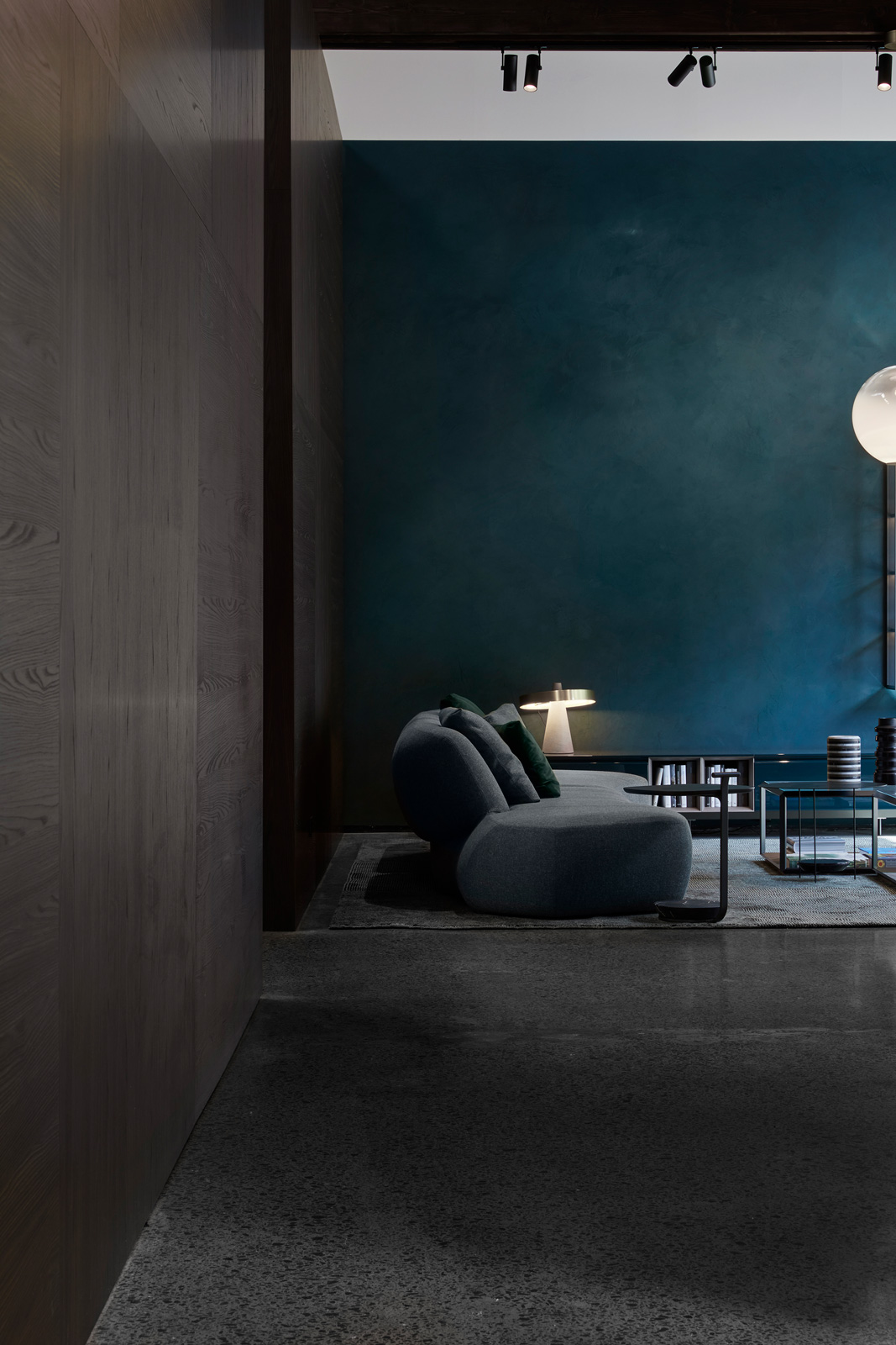 Distinguishing elements of the space includes matt polished concrete floors and the walls of each space are decorated with a distinctive colour: from petroleum to anthracite, finishing with a splendid wooden boiserie, giving a strong character to the respective individual space.