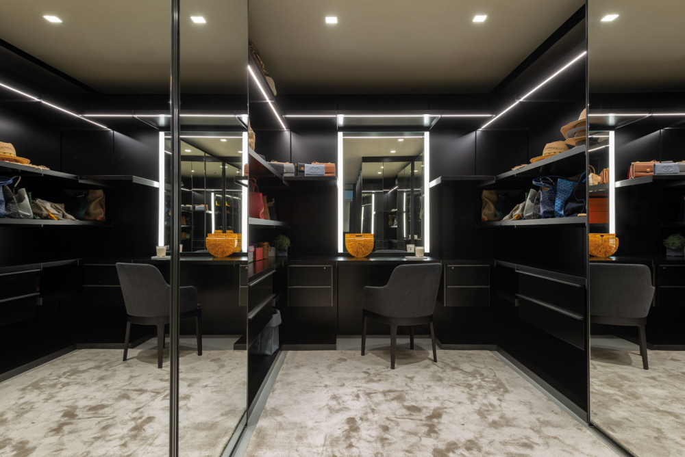 Starting from the beginning of the project, the partnership with the Molteni&C|Dada Contract Division allowed to achieve the goal of abstraction required by the client. Thus, indoor walls are either exposed reinforced concrete or covered with custom made matt black panels. Cement resin floors give indooroutdoor continuity. Ceilings painted with semi-gloss black varnish with a wood effect gives continuity to wall boiserie.