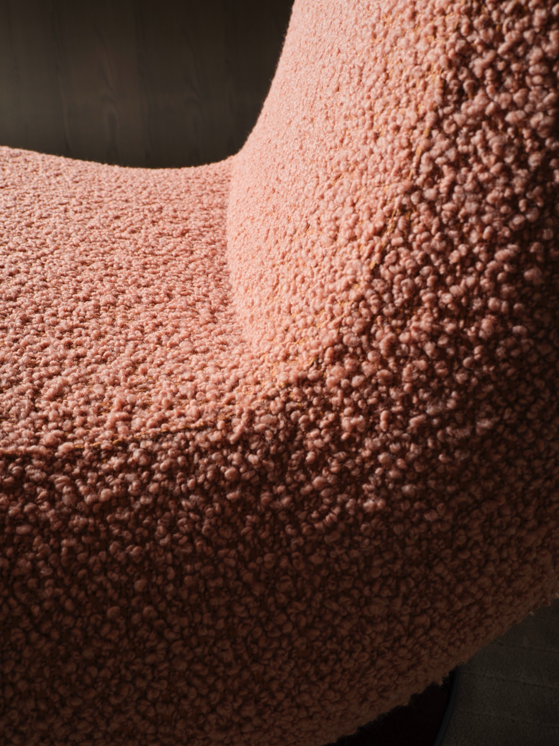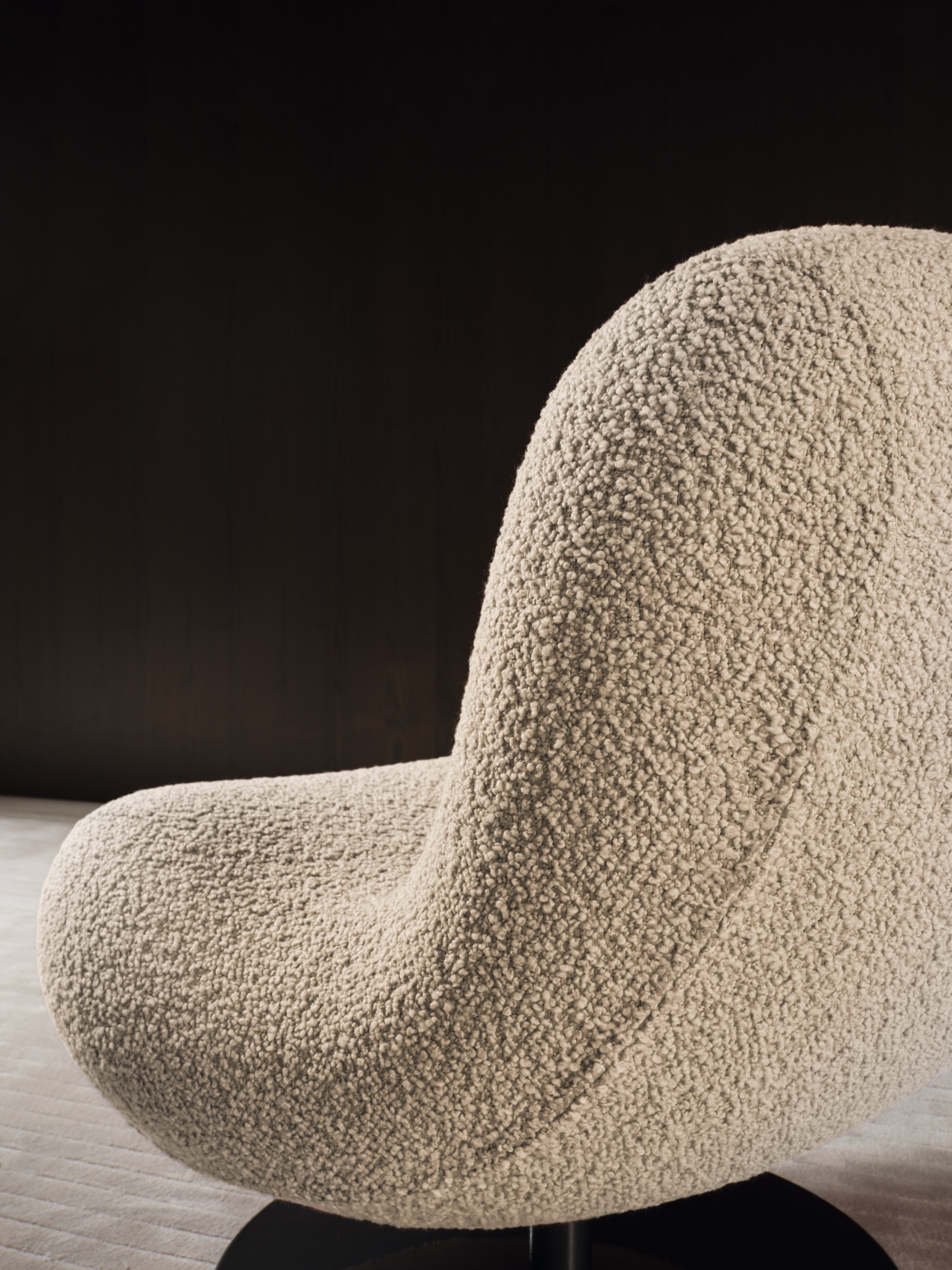 The seat is built around a metal frame with variable‑density padding, calibrated to respond to different points of contact. Subtle stitching runs along the sides, tracing a curved line that follows the movement of the form without interrupting its surface. The upholstery wraps the armchair completely, reinforcing the sense of enclosure and visual cohesion.