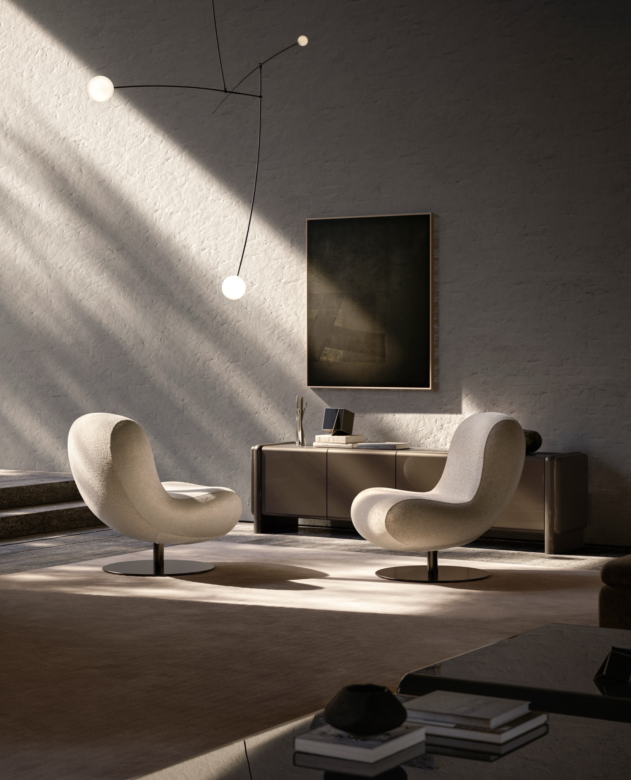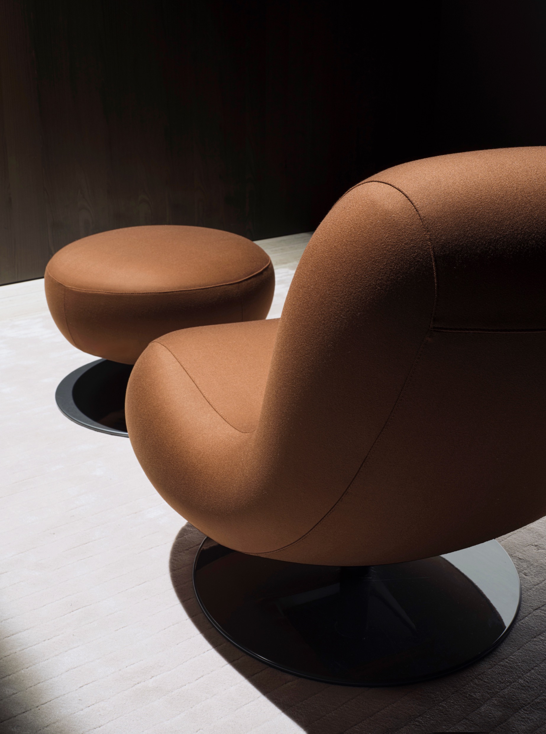 A swiveling metal base, reduced to a round disc with a central supporting column, anchors the volume while allowing freedom of movement. When paired with the matching footstool, Bosco extends its function into an even more relaxed posture.