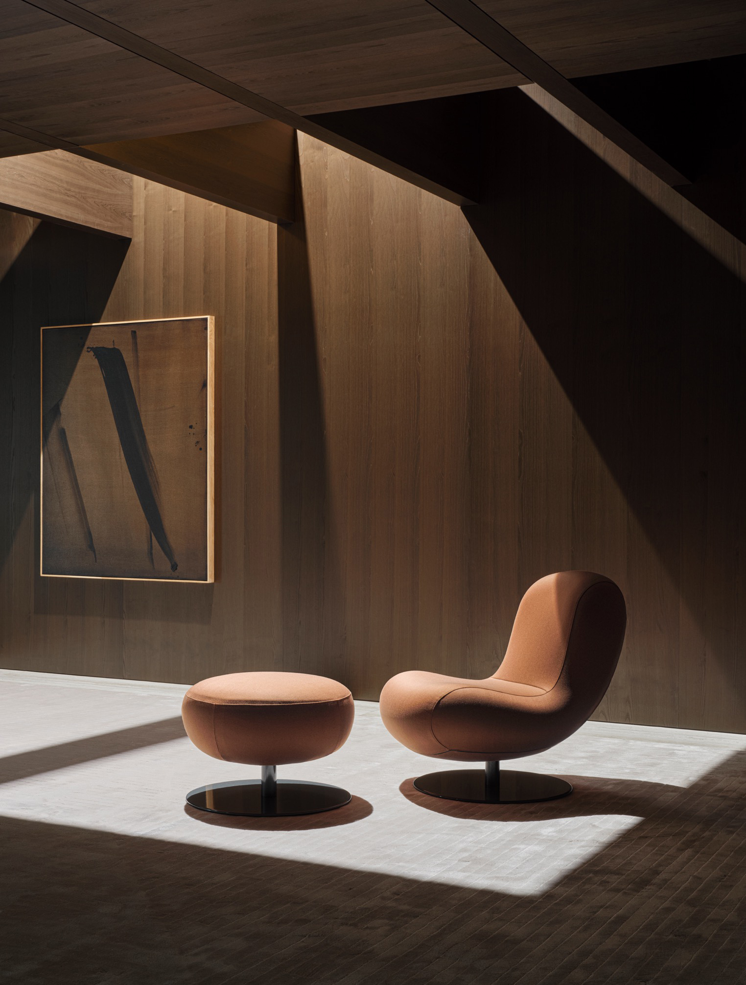 The Bosco armchair by Naoto Fukasawa is an armchair that invites the body to let go. Inspired by the gentle hills of Tuscany, its soft, generous volume and subtly divided contours, echo the rhythms of the landscapes. Its form is defined by generous volumes that support the body naturally, allowing the sitter to settle into the chair's embrace. The design favors continuity, shaping a compact silhouette that feels stable, protective, and calm within the space.