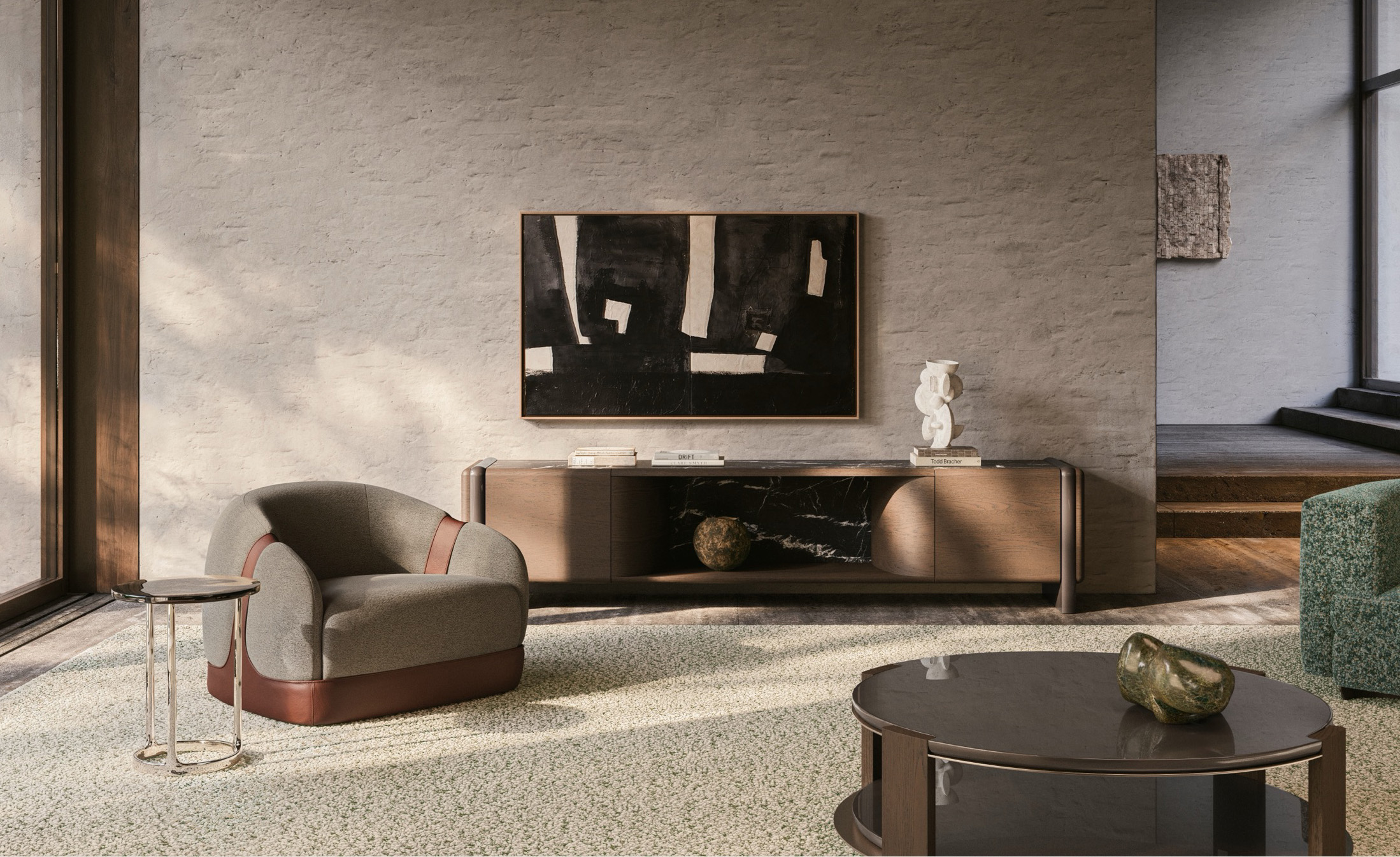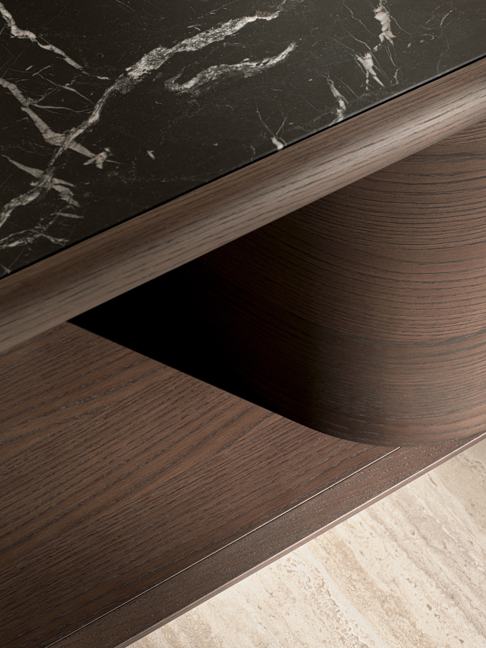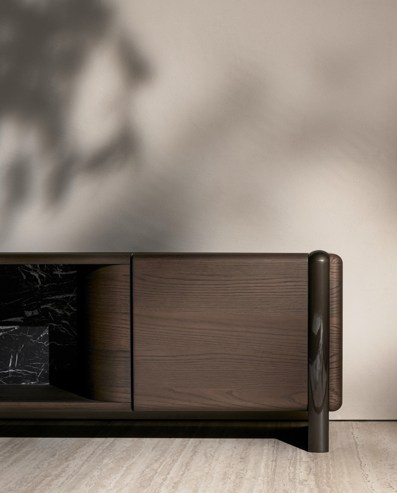 The Midday sideboard by GamFratesi is crafted with a clear, grounded construction. The design's form is reduced to a few essential elements: a central body supported by two legs, joined through a connection that reads as structural rather than decorative. Its proportions are calm and deliberate, giving the piece a stable silhouette suited to everyday use.