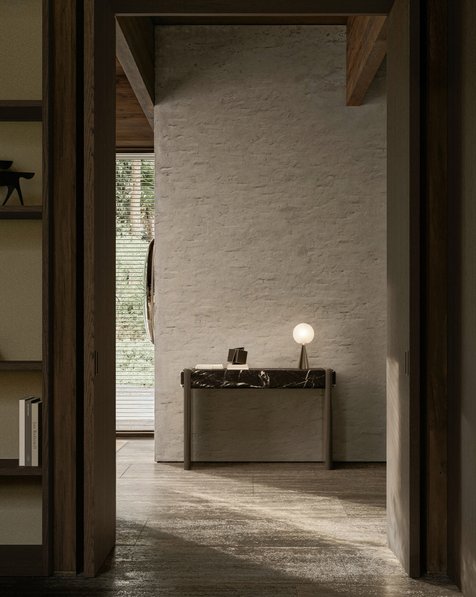 The Midday console by GamFratesi translates the constructive logic of the sideboard into a lighter, more compact design. Defined by a reduced depth and a clear structural outline, the piece is built around the same essential composition: a central body supported by two legs, joined through a visible and deliberate connection.