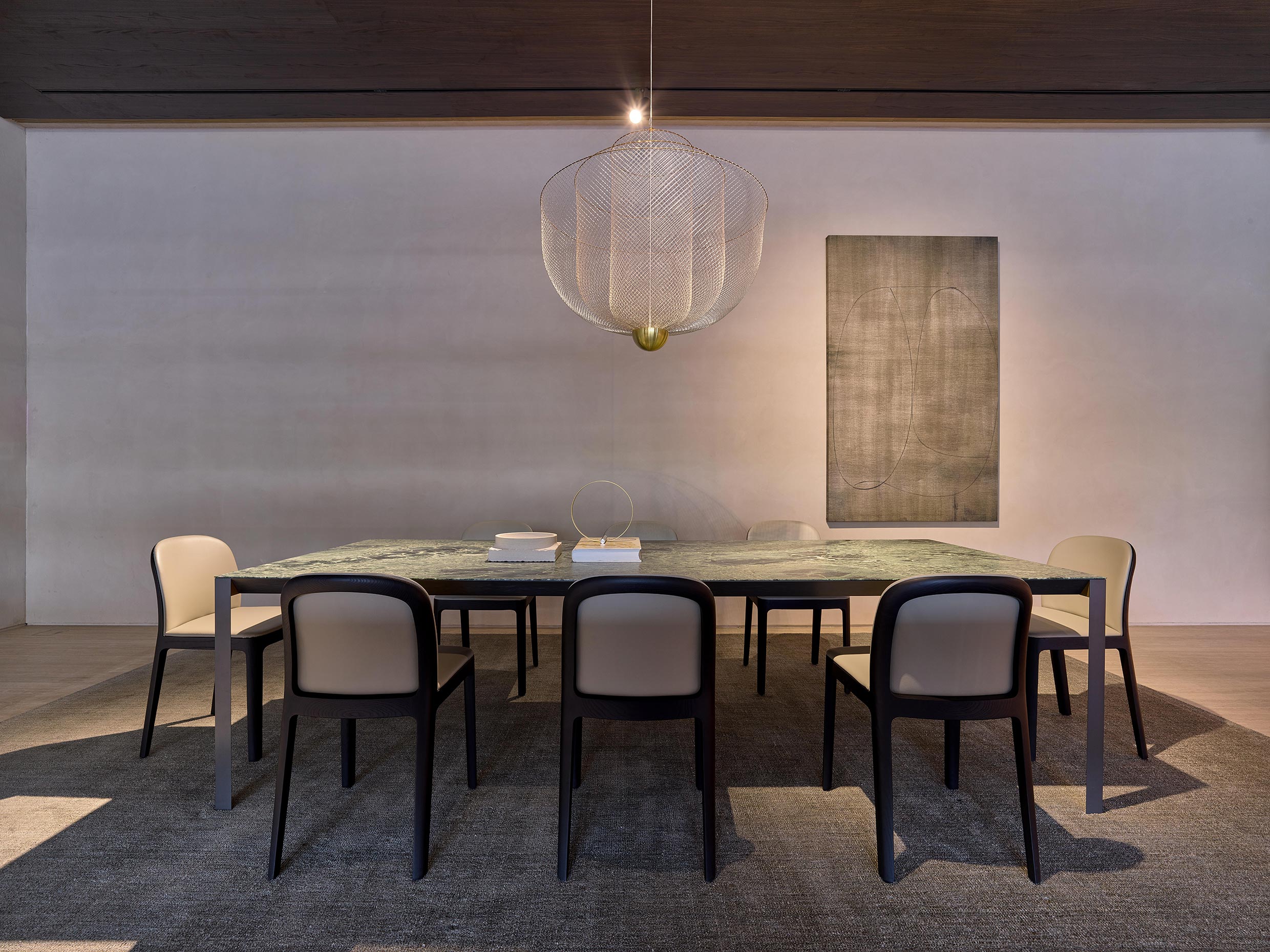 A first living and dining area welcomes the guest into the space, showcasing the Asterias table by Patricia Urquiola and two the most iconic pieces the Italian brand, the D.154.2 armchair by Gio Ponti and the iconic Piroscafo, whose story encompasses the strength of Molteni&C link with tradition.