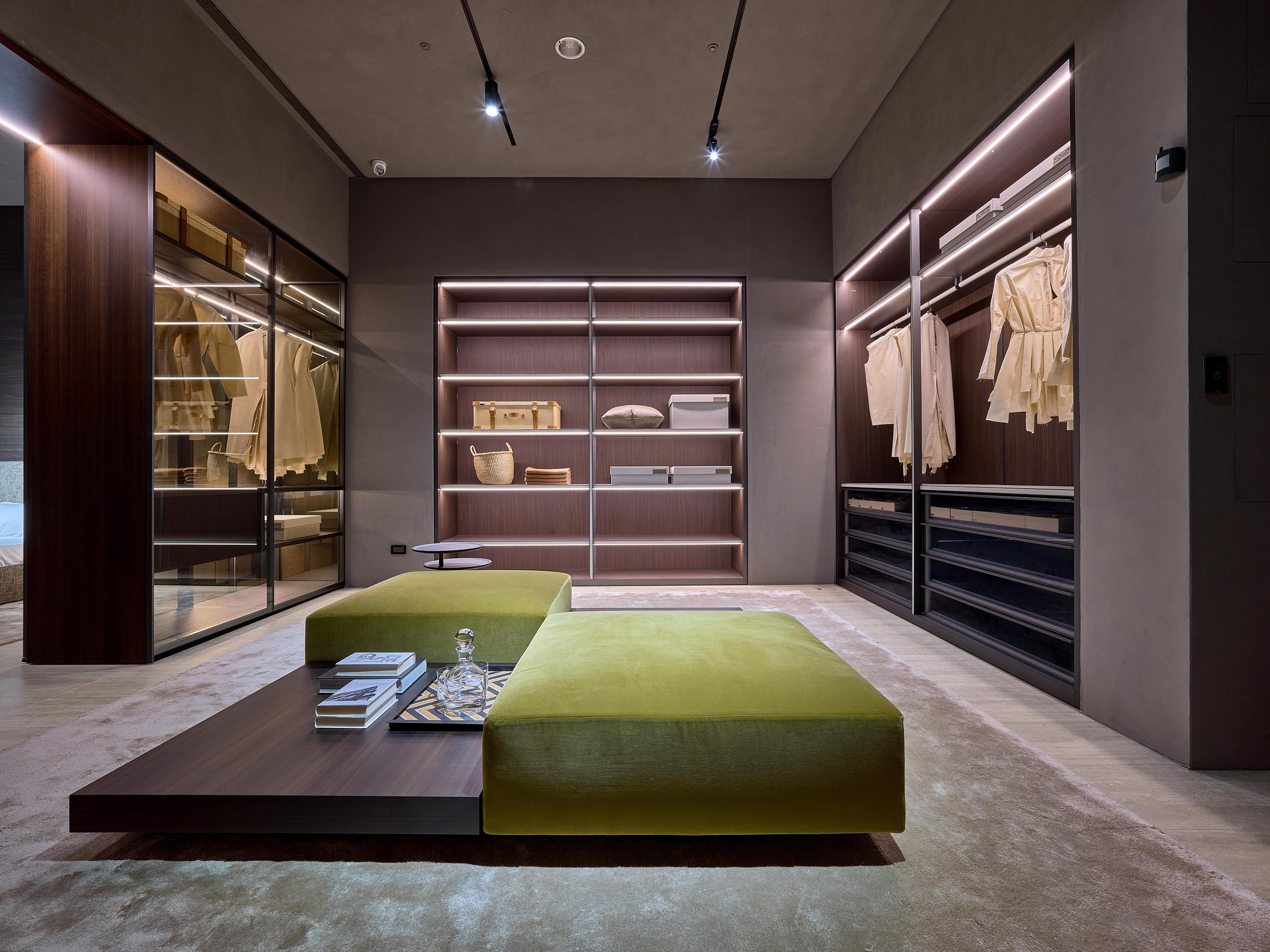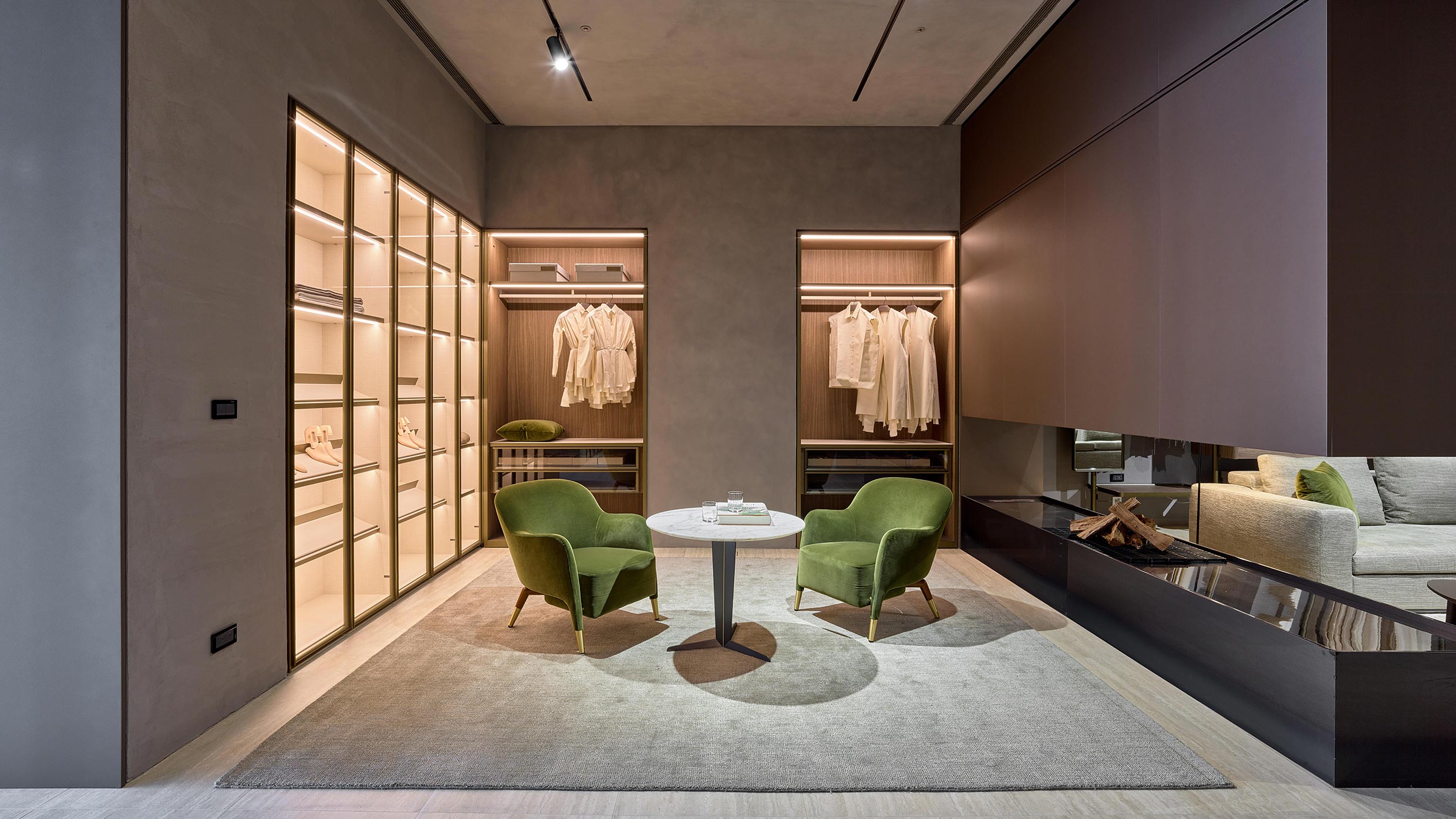 The night-time area features Gliss Master, the wardrobe system that is the feather in the cap of Molteni&C’s night Collection, as well as a cosy lounge area with Attico small table by Gallizia and the D.151.4 armchairs by Gio Ponti.