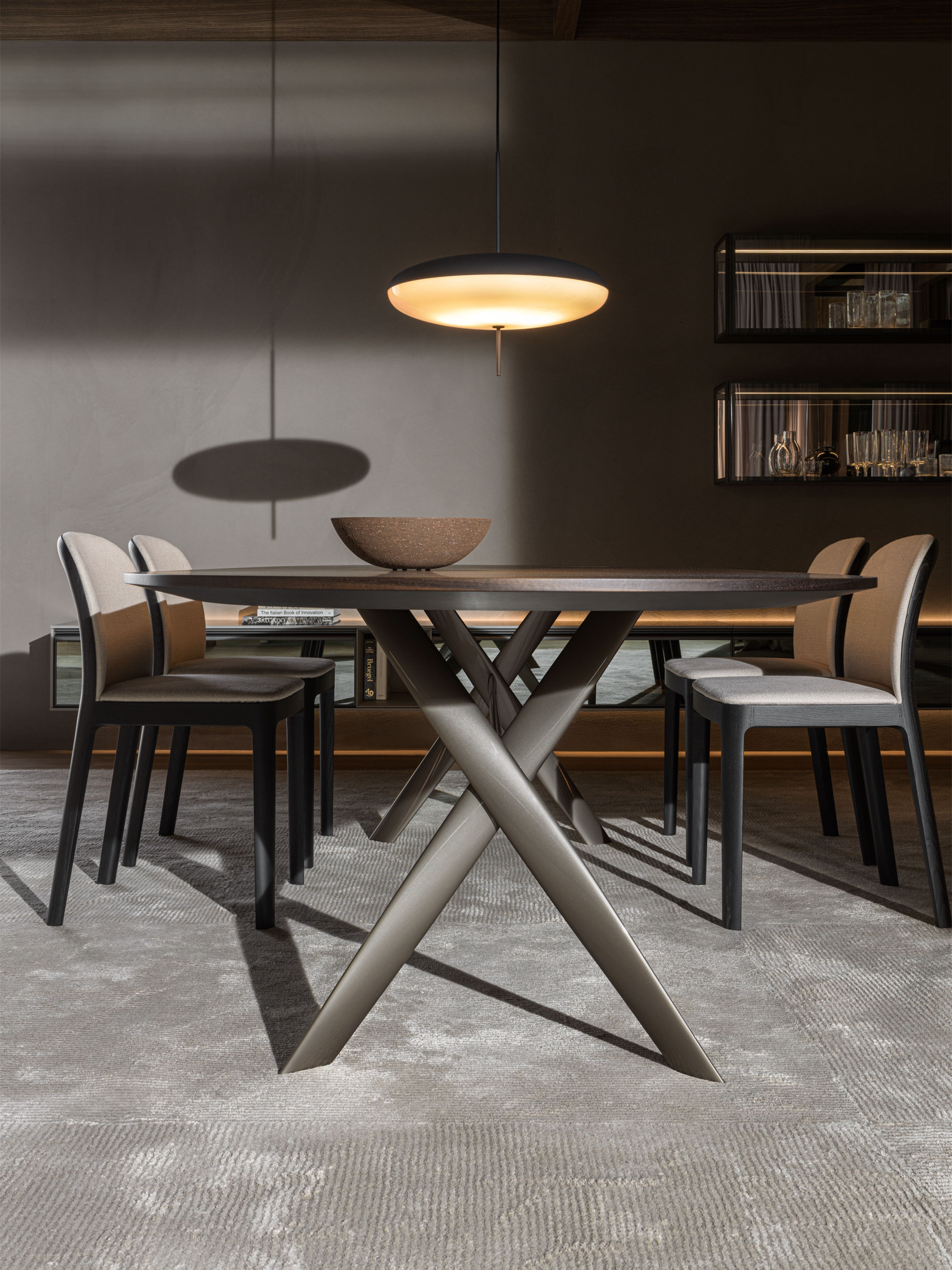 Este proyecto de mesa, del arquitecto milanés Rodolfo Dordoni, toma su nombre de uno de los aeropuertos londinenses con más tráfico de pasajeros en el mundo. Un Hub donde viajeros cosmopolitas se juntan a cualquier hora del día y de la noche con destino a la capital de Reino Unido o para salir de la misma, justamente como una mesa donde la gente se junta para cenar. Es la peculiar estructura de aluminio retorcida y cruzada que recuerda la hélice o una pala de helicóptero el elemento que ha inspirado su nombre.
