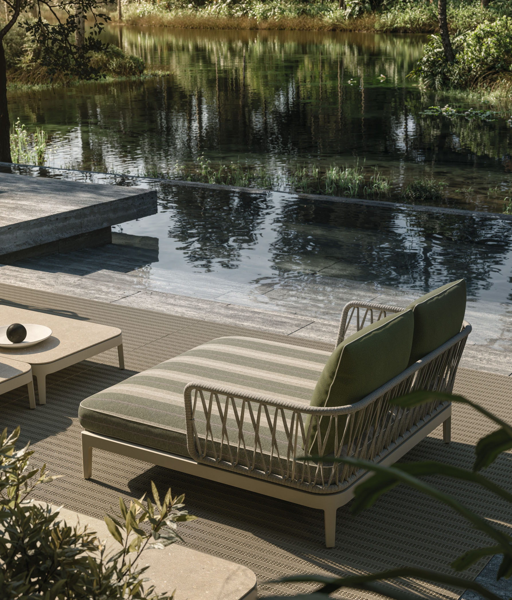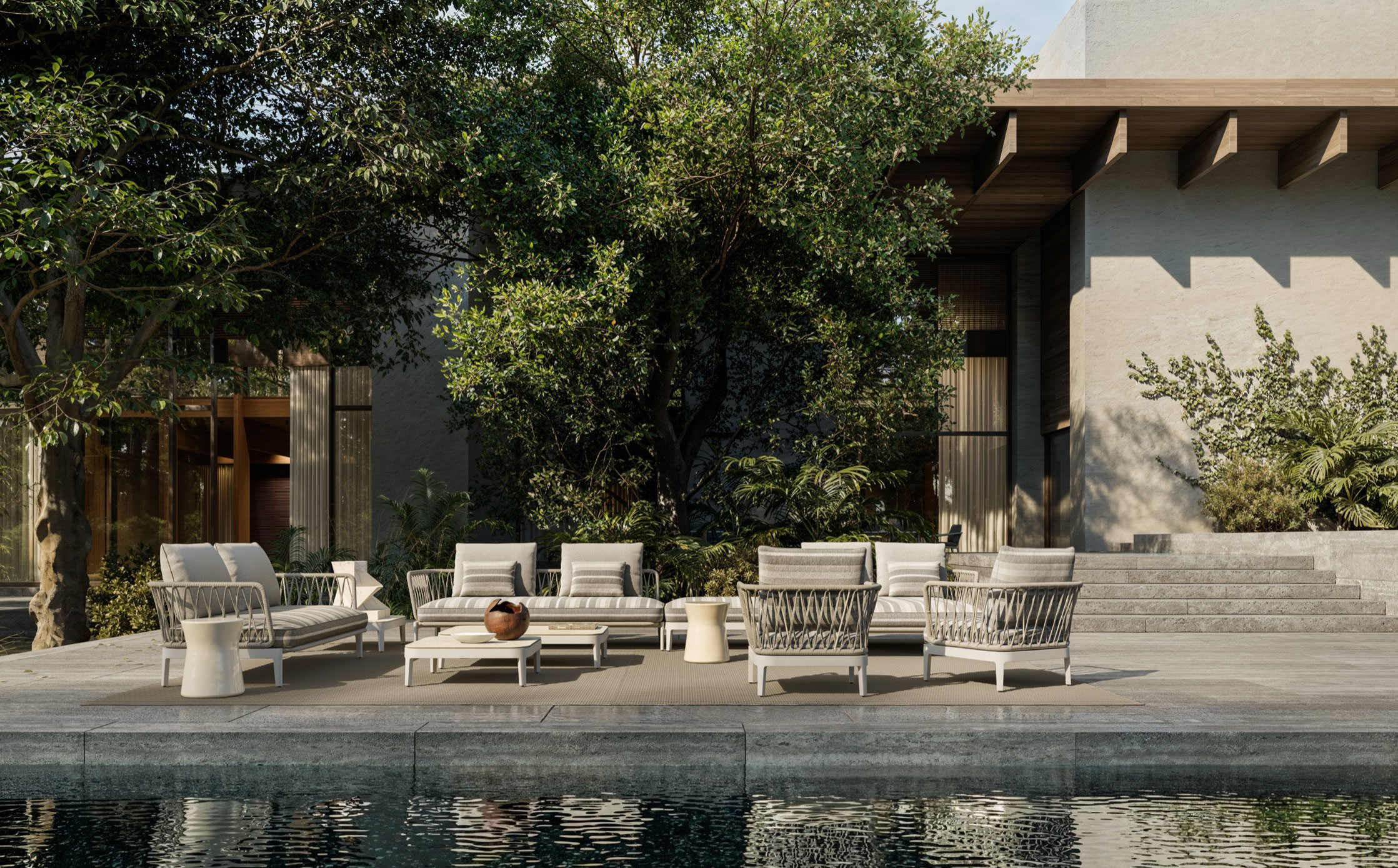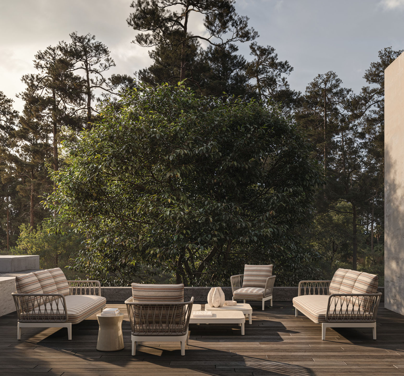 Evoluzione raffinata del concetto originale indoor, il divano modulare Chelsea Outdoor reinterpreta la propria identità distintiva per la vita all’aria aperta, preservando al contempo la coerenza formale della collezione. Sviluppata da Studio Dordoni, la versione outdoor traduce la chiarezza architettonica del sistema indoor in una struttura progettata per garantire durabilità, comfort ed eleganza visiva.