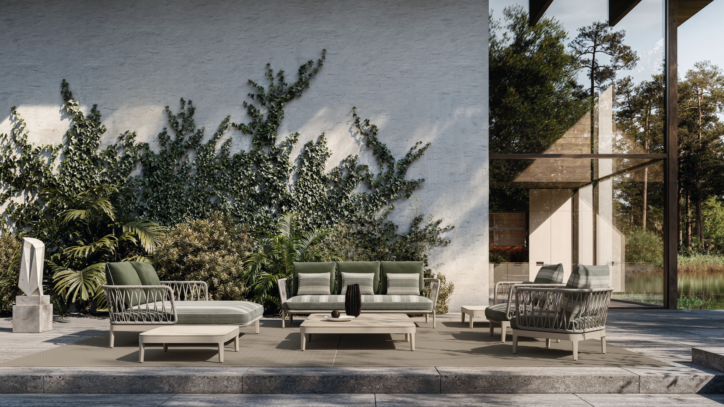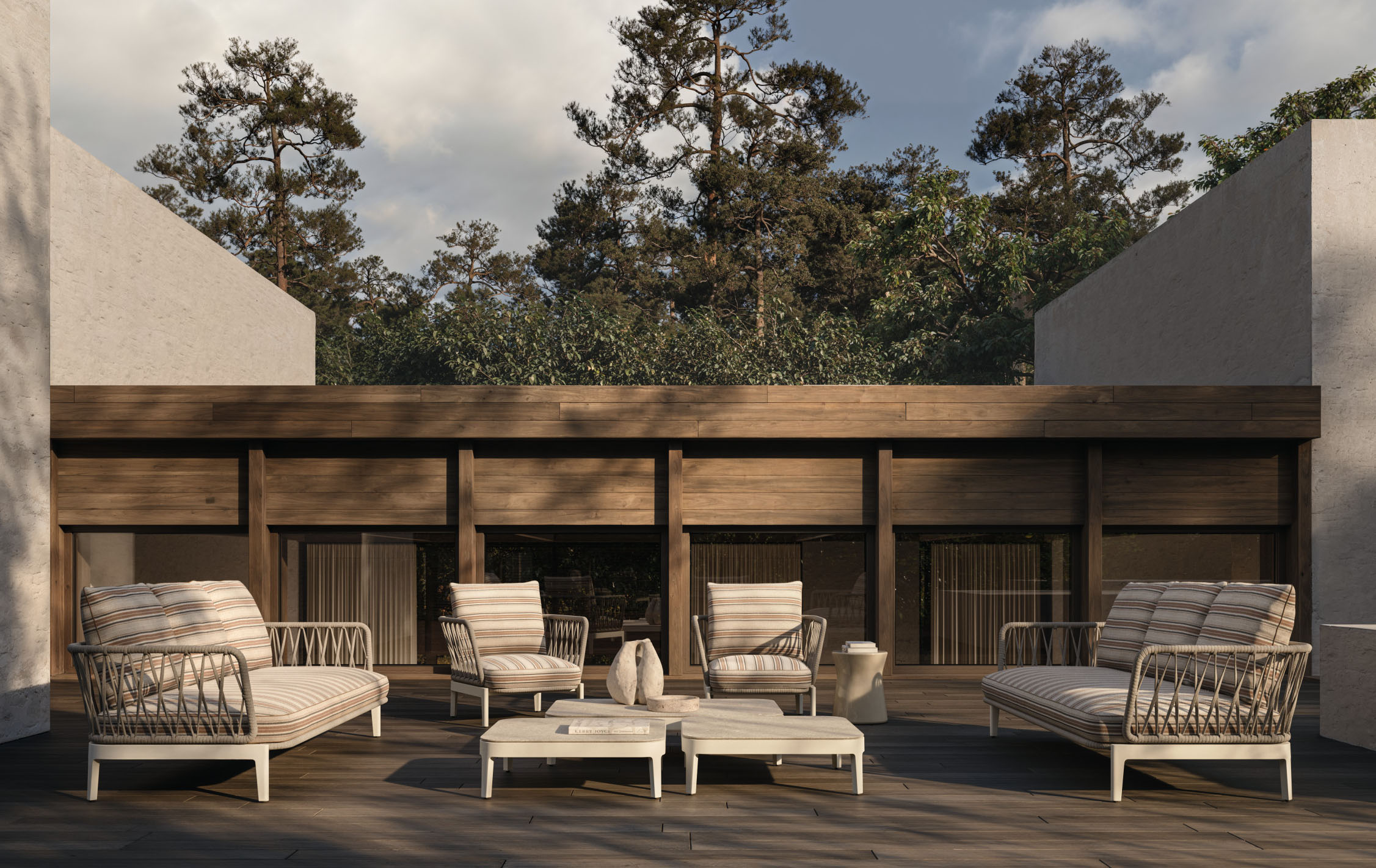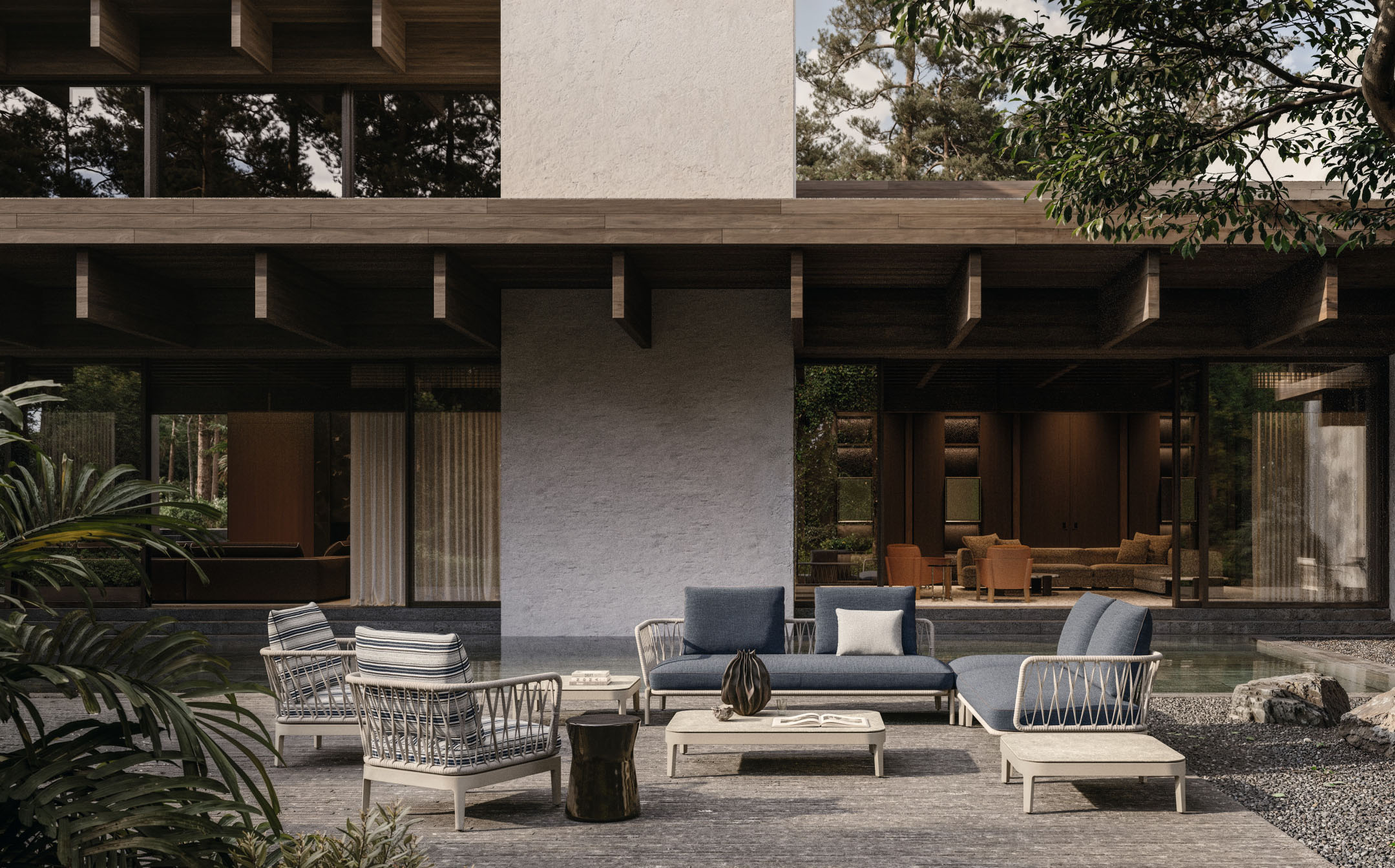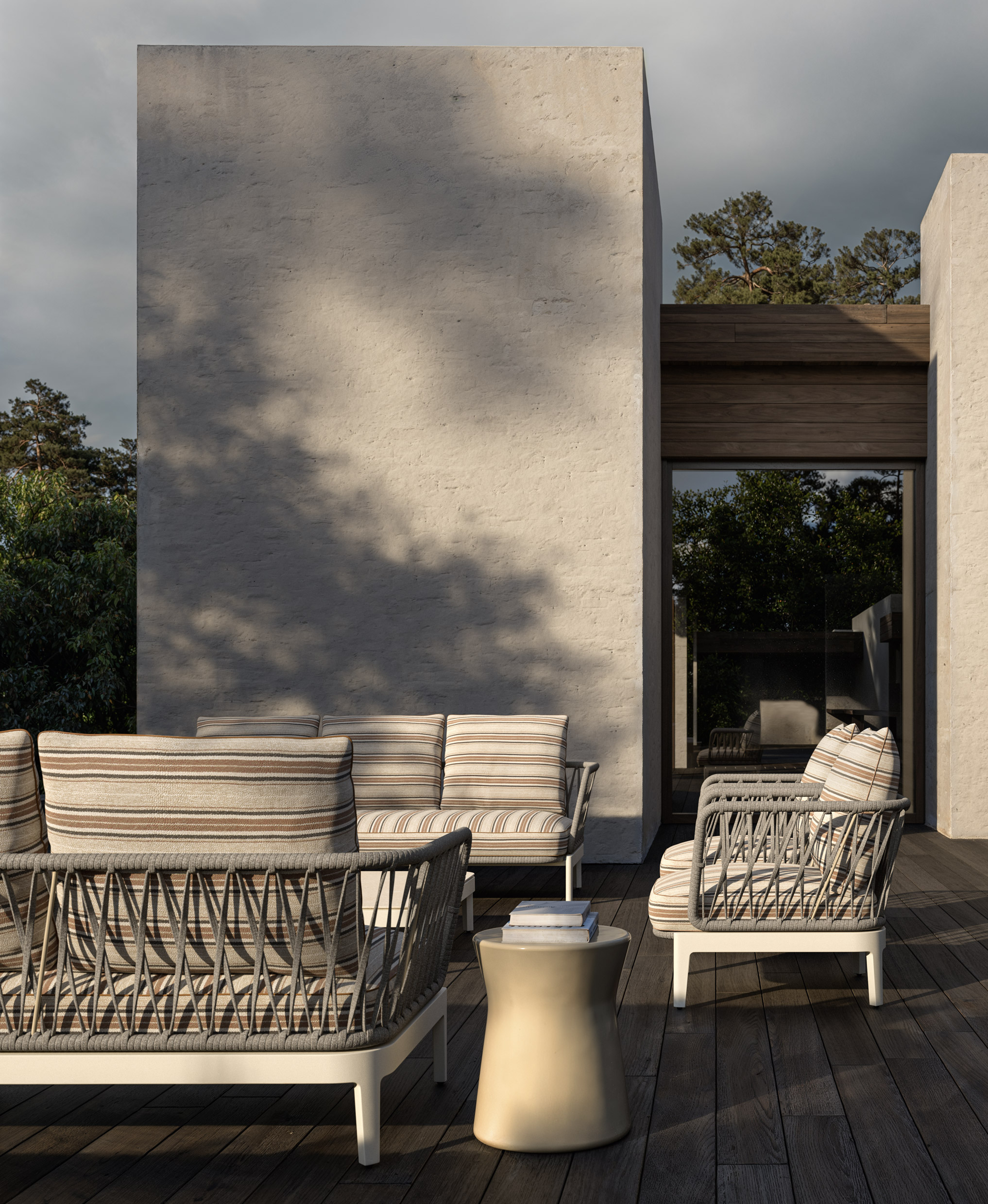 Evoluzione raffinata del concetto originale indoor, il divano modulare Chelsea Outdoor reinterpreta la propria identità distintiva per la vita all’aria aperta, preservando al contempo la coerenza formale della collezione. Sviluppata da Studio Dordoni, la versione outdoor traduce la chiarezza architettonica del sistema indoor in una struttura progettata per garantire durabilità, comfort ed eleganza visiva.