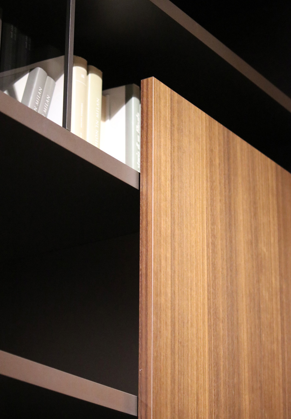 発売以来リニューアルを重ね今や代名詞的存在となったシステム収納「505」。新たに追加されたドアは、浮遊感のある独特の表情を生み出し、棚板やサイドパネルの「線」とドアが作る「面」のコントラストが空間をより立体的に見せる。