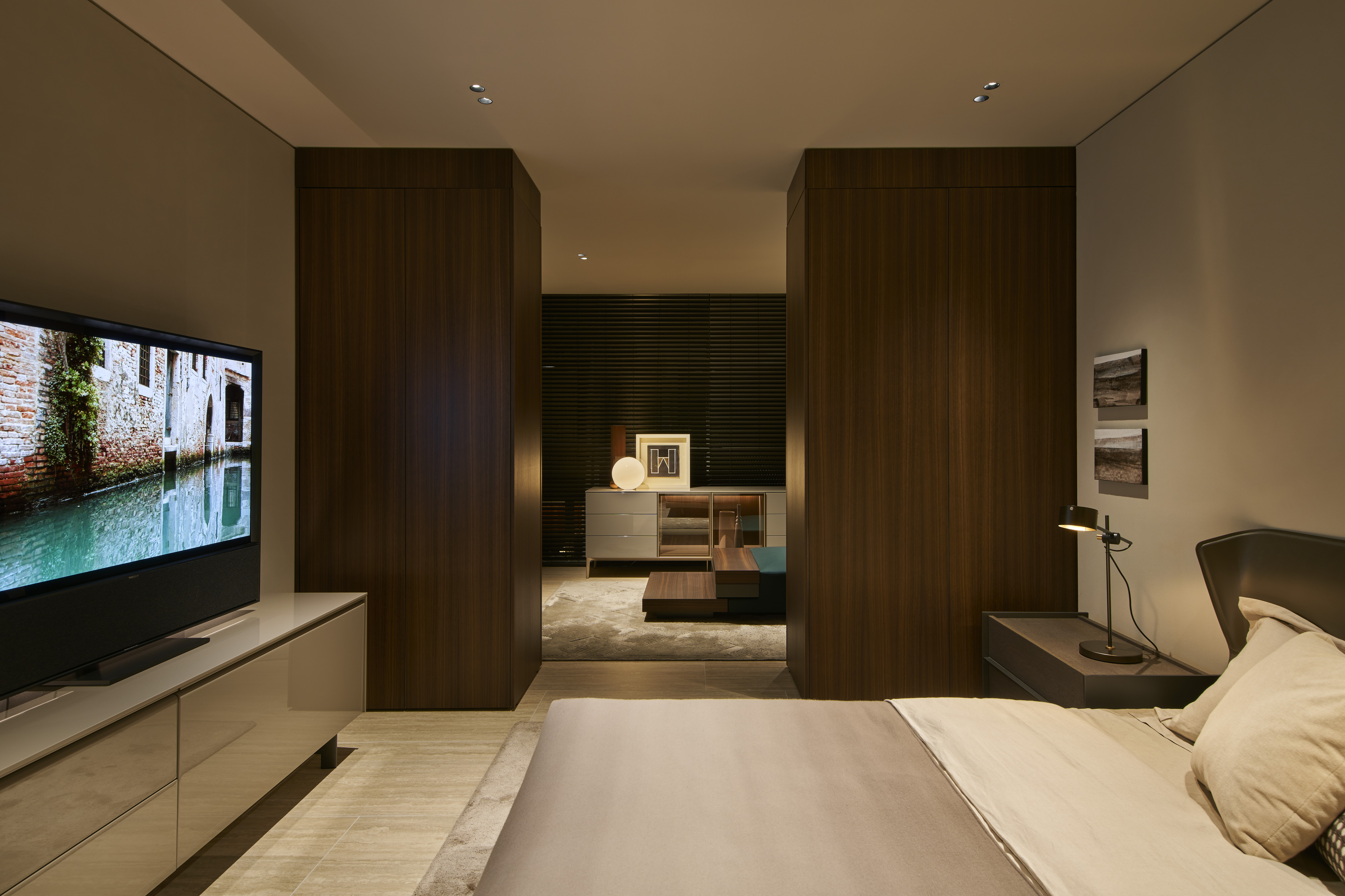 オープンシェルフで区切られた先にあるのは、プライベート感のあるメインベッドルーム。ベッドの足もとにはゆったりとしたチェアとベンチで居心地の良い小さなラウンジスペースを設けています。眠りにつく前の穏やかな休息の時間を演出します。