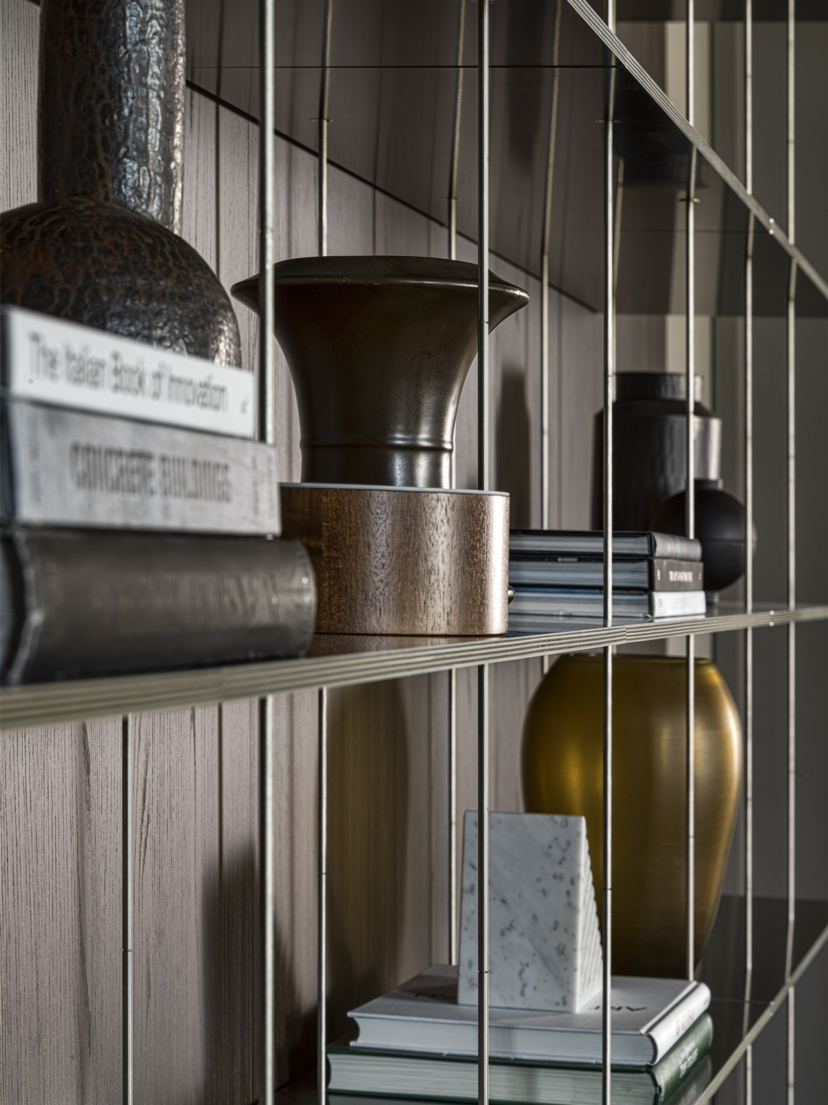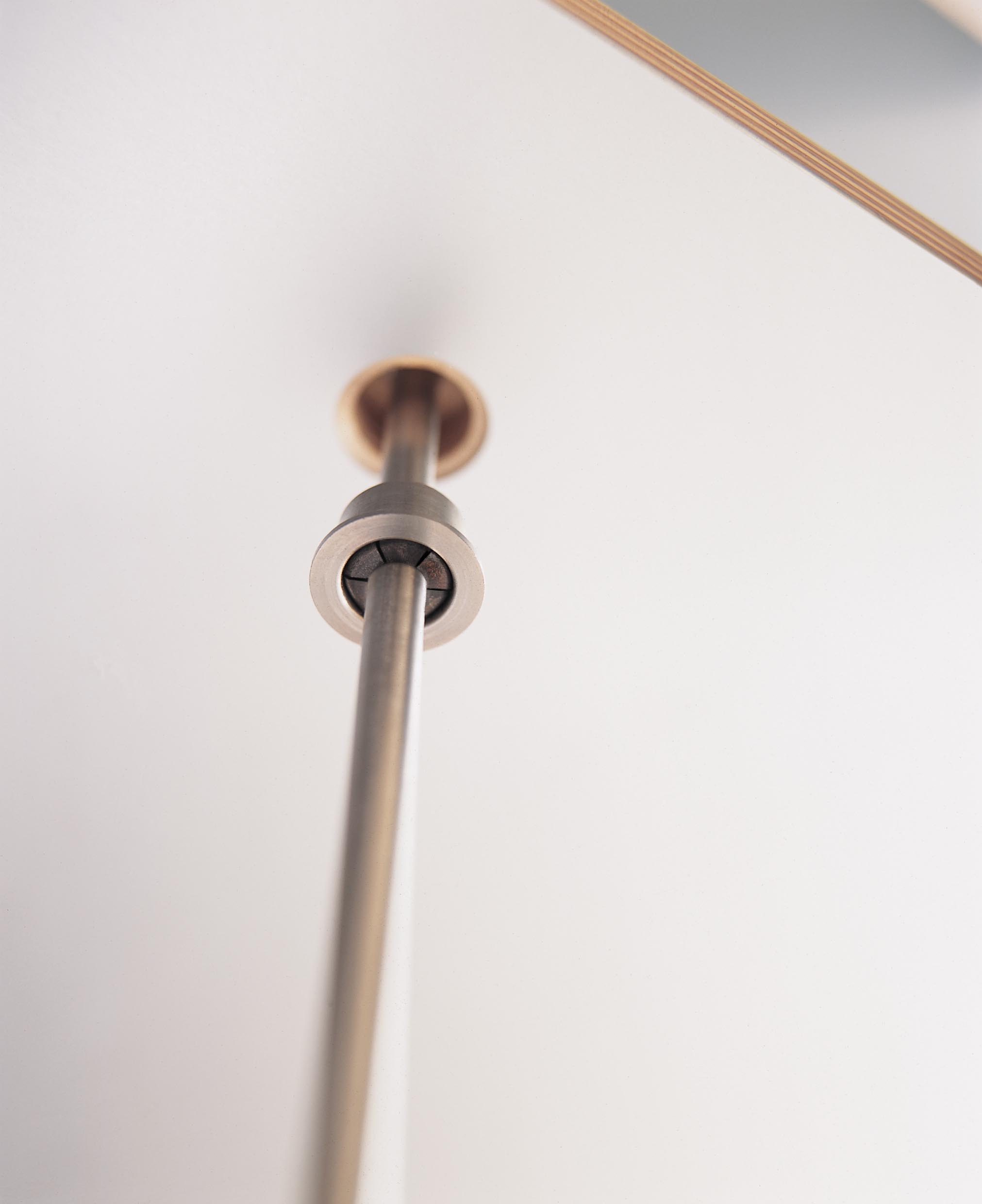 最上部の棚板のみを壁に固定し、細いロッドを吊り下げ、棚板を載せる構造で、この上なく薄くミニマルなオープンシェルフ。