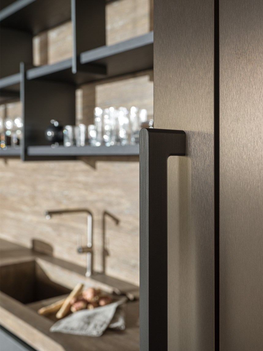 ヤブ・プシェルバーグ解釈によるキッチンは、内部がすぐに圧倒的な遠近感を与えます。それは、大理石もしくはストーン材を使用したワークトップの曲線とベ大理石で覆われた背面パネルは、舞台の背景の役割を担って斬新なデザインの棚を備え、必要なものがすぐ見えるように開いた状態です。さらに新しいハンドル YP も、革新的なデザイン。