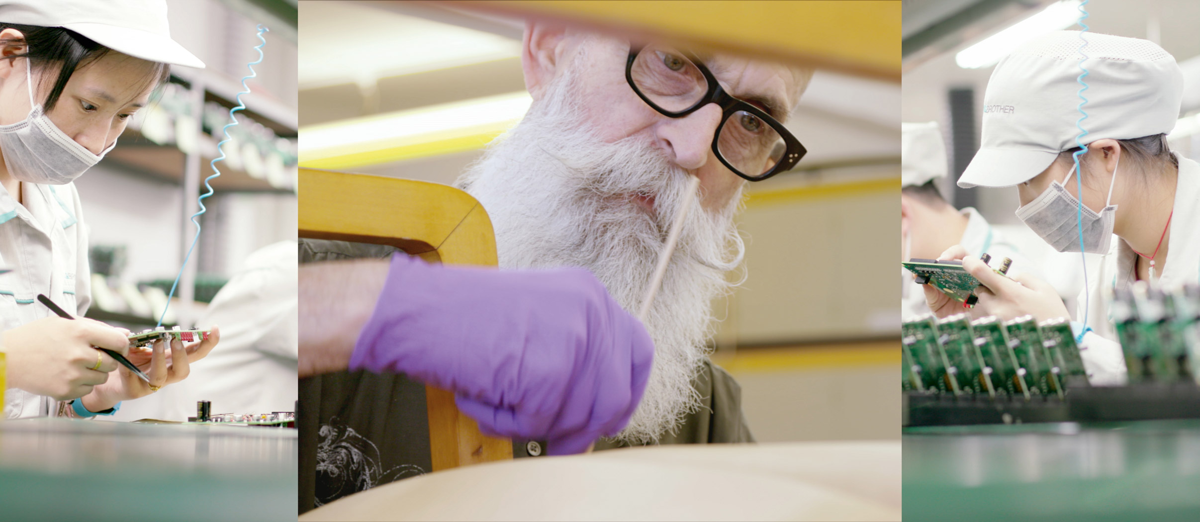 The multi-screen format of the film installation was inspired by the immersive productions of Charles and Ray Eames in the 1960s, allowing multiple curatorial narratives to be told at the same time. These include an introduction to the V&A itself, showing the work of the museum’s restorers, alongside scenes from a Finnish furniture factory, shipping containers being unloaded and diners eating at side-street restaurants in the immediate vicinity of Design Society, which is located in the coastal city of Shenzhen.
