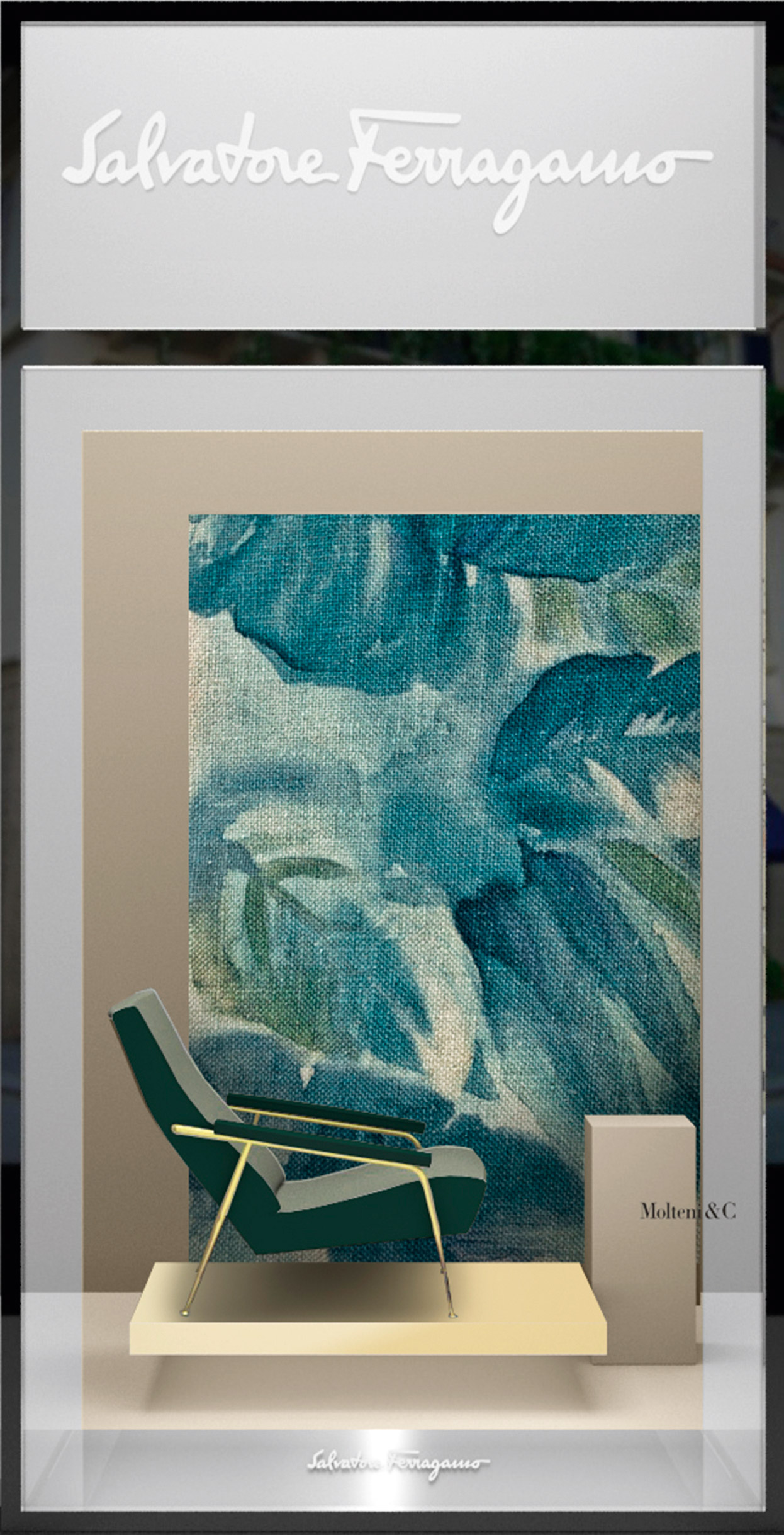 Salone del Mobile 2016 - New skyline for the event promoted every year by Molteni&C and Salvatore Ferragamo: alongside the historic window displays of Boutique Donna in Via Montenapoleone, this year Boutique Uomo too is showcasing the "Materia" installation, inspired by Molteni&C’s new textile collection. Materia is the result of careful recovery and research work into the archives of the greatest Italian textile manufacturers, three new textile designs, inspired by the world of Nature: Foliage and Roots plus a more sophisticated interpretation of Viennese cane seating in Paglia.
