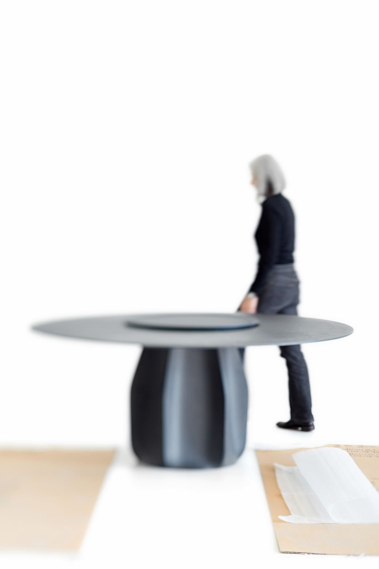 In the center of the horizontal scene, static and totemic in the milky rarefaction of the space, that table hosts a reversal, an exchange between proportions and perceptions, a process of infinite recomposition of the focal points. Enveloped and guided by a dynamic vertical presence, a black and white abstraction that caresses the surface that becomes a screen, perhaps a banquet, community. In the infinite circular movement, the sidereal dialogue between shades of white is interrupted by an intimate, domestic sentiment, the brown of the packaging, cardboard as a rug and anchorage, recollection and memories of countless arrivals and departures.