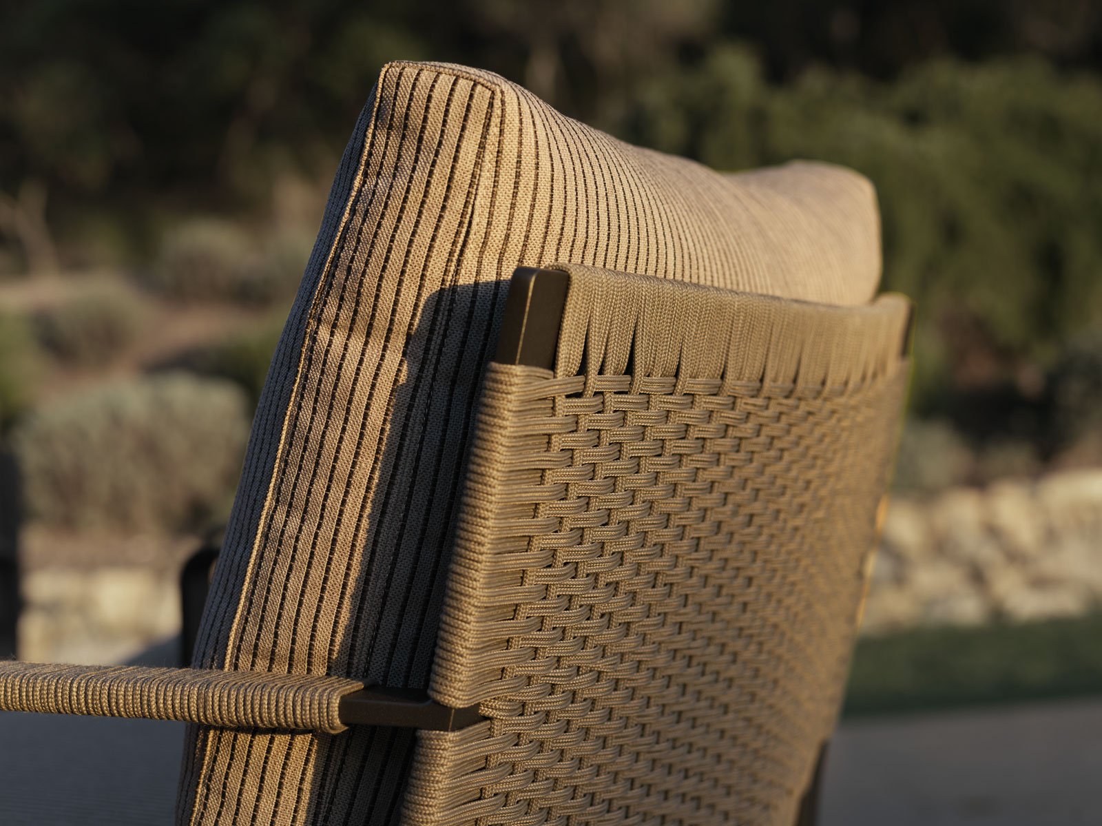 The sunbed, the archetype par excellence of outdoor furniture, interprets all the elements that characterise the aesthetics of the Timeout Collection, re-proposing the theme of the burnished painted aluminium band, running along the entire profile, and the traditional motif of the polypropylene rope weave.