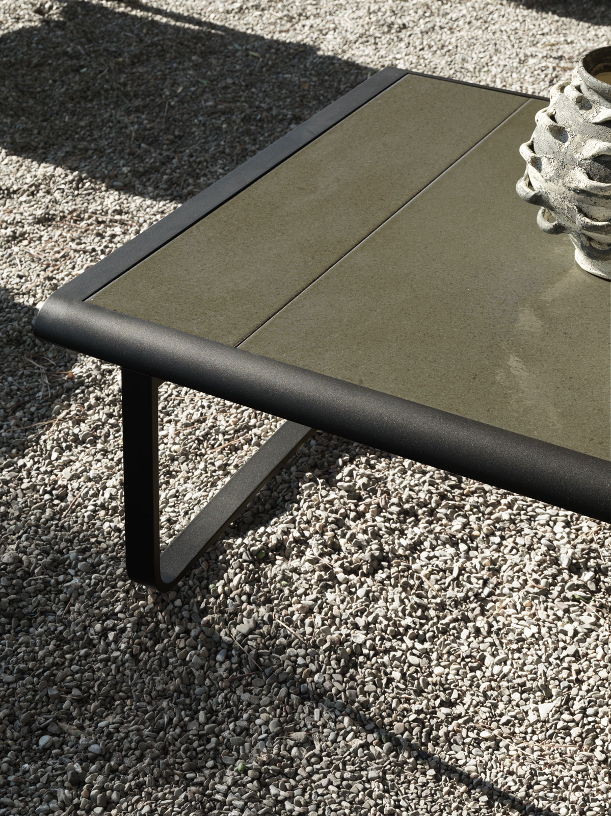 Completing the Timeout Collection is a large low table in two widths, for versatile, intimate or convivial outdoor living spaces. It picks up on the aesthetic motifs of the collection such as the burnished aluminium band, profiles and rounded corners. The support bases, obtained from the continuous run of the same band, are set back from the top to make it visually lighter, as if suspended.