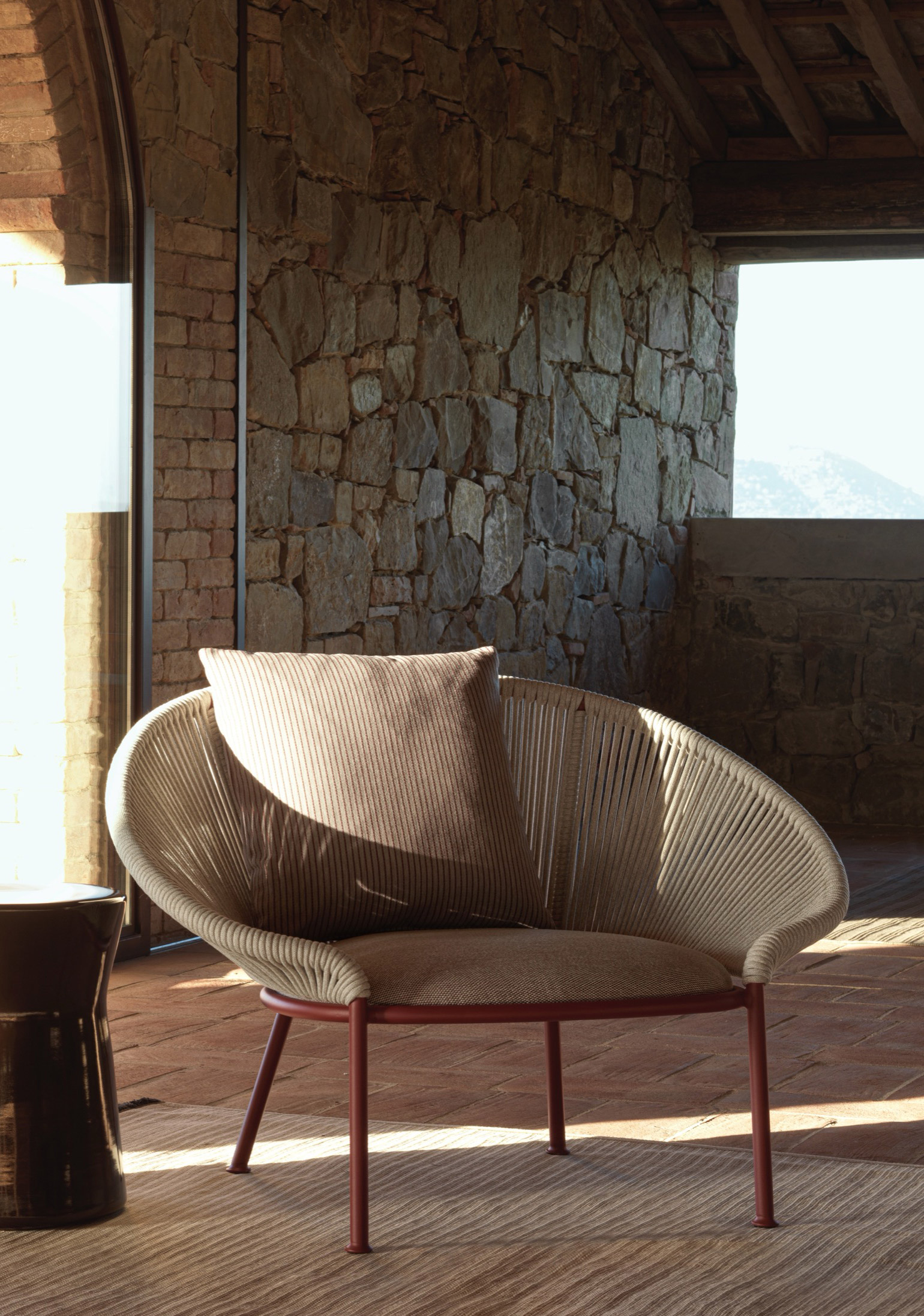With the Petalo armchair and pouf, Vincent Van Duysen enhances the Outdoor Timeout Collection with gentle curves and delicately enveloping seating.