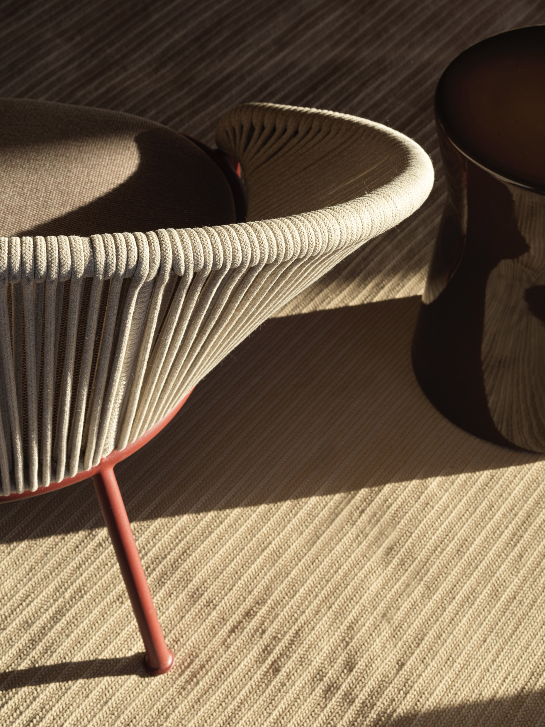 The interaction between the two collections is enhanced in a comfortable pouf, in two sizes, with a woven texture, to complete the accessories proposal of the Timeout Collection.