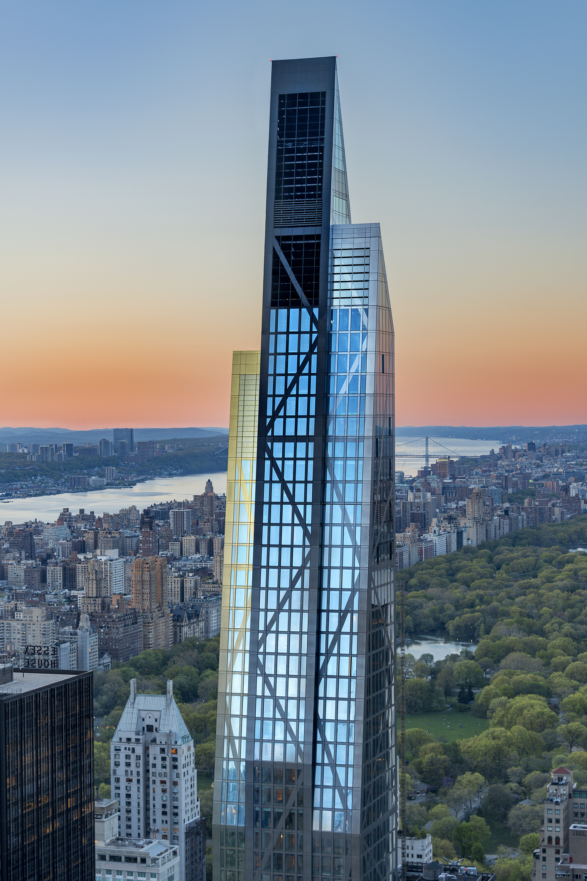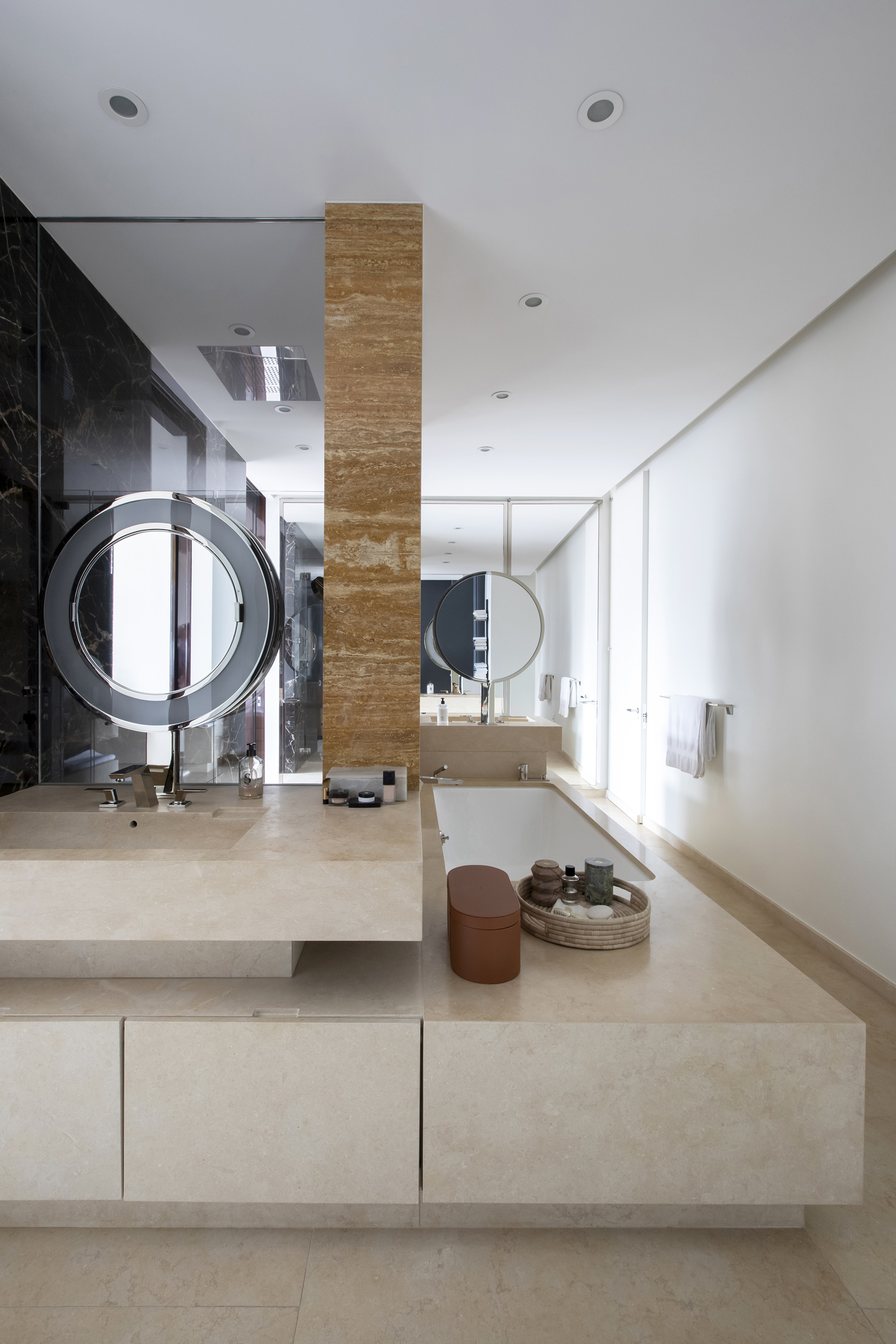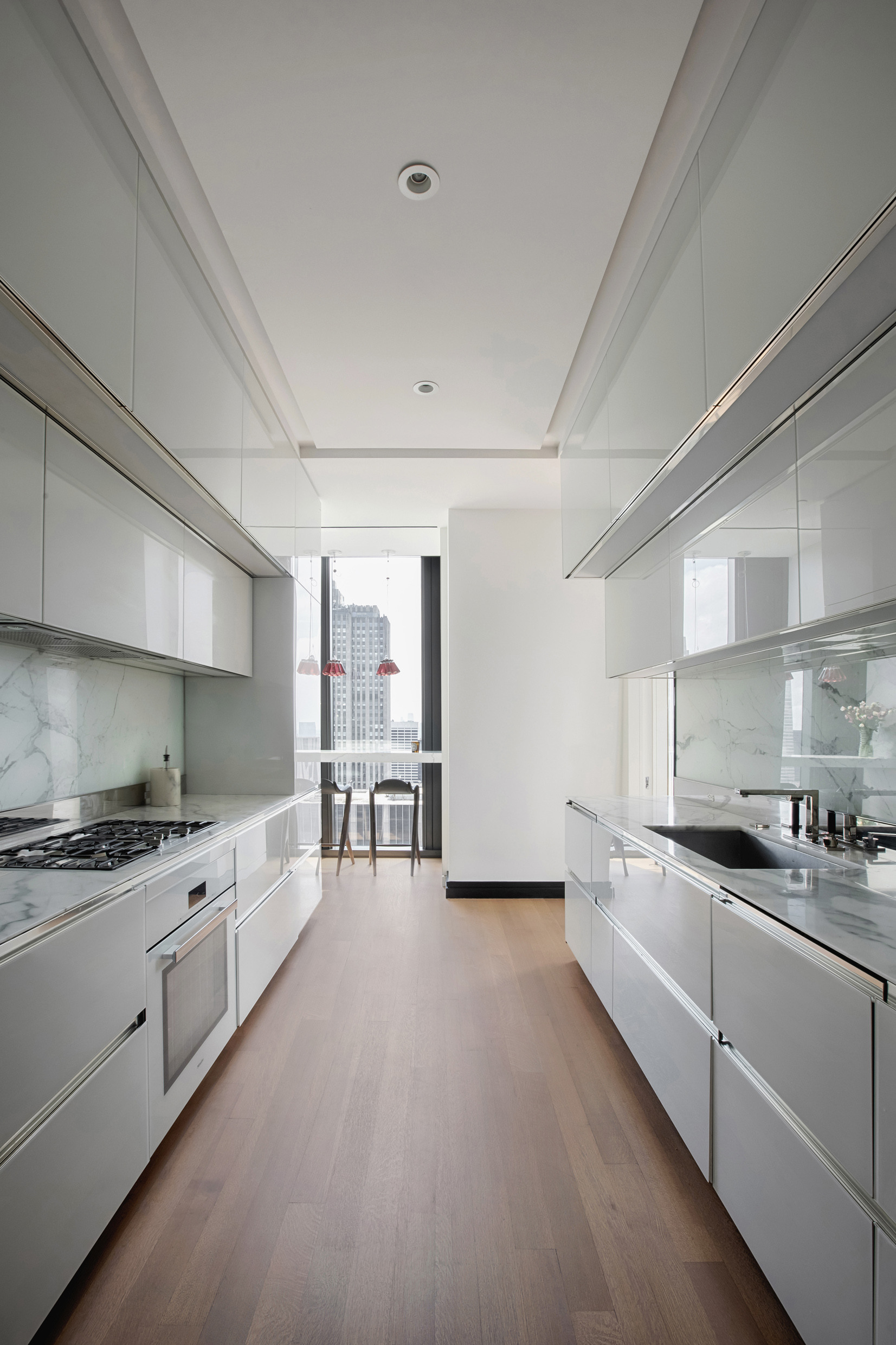 Despont’s interior vision, rooted in a palette of oak, marble, and bronze, is elevated by Molteni&C’s bespoke craftsmanship. The kitchen is defined by white marble countertops and backlit backsplashes, paired with back-painted glass doors framed in aluminum — a material dialogue that echoes the tower’s crystalline geometry and ever-shifting reflections.