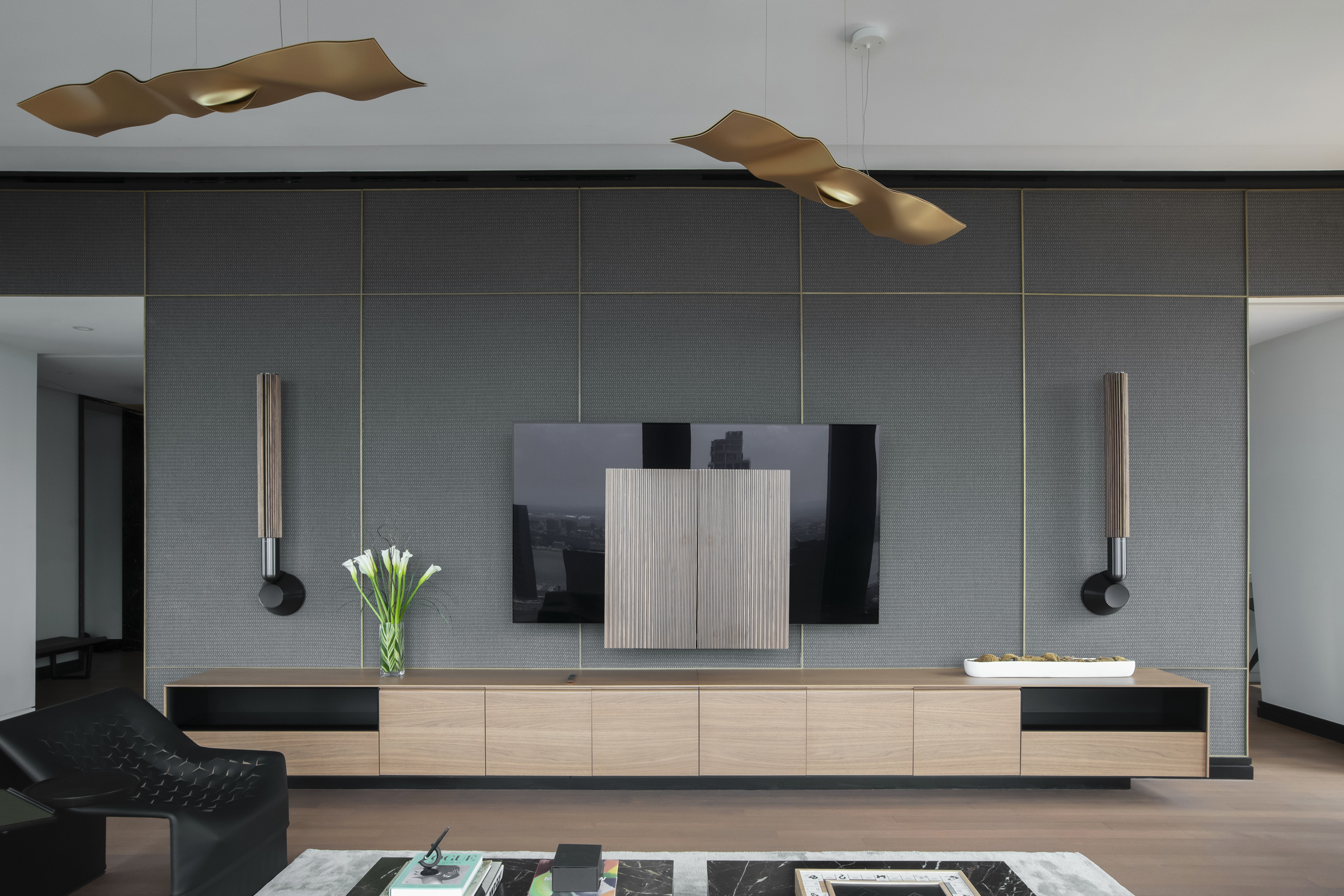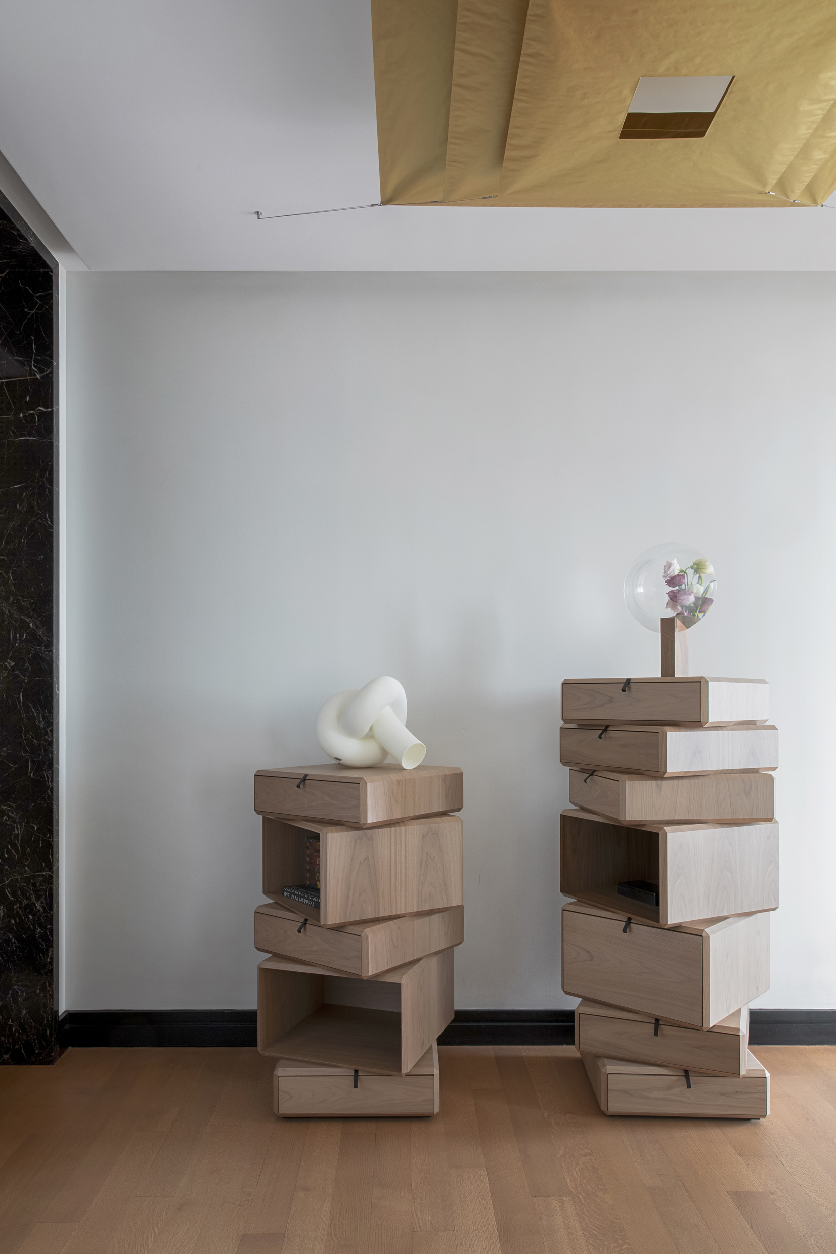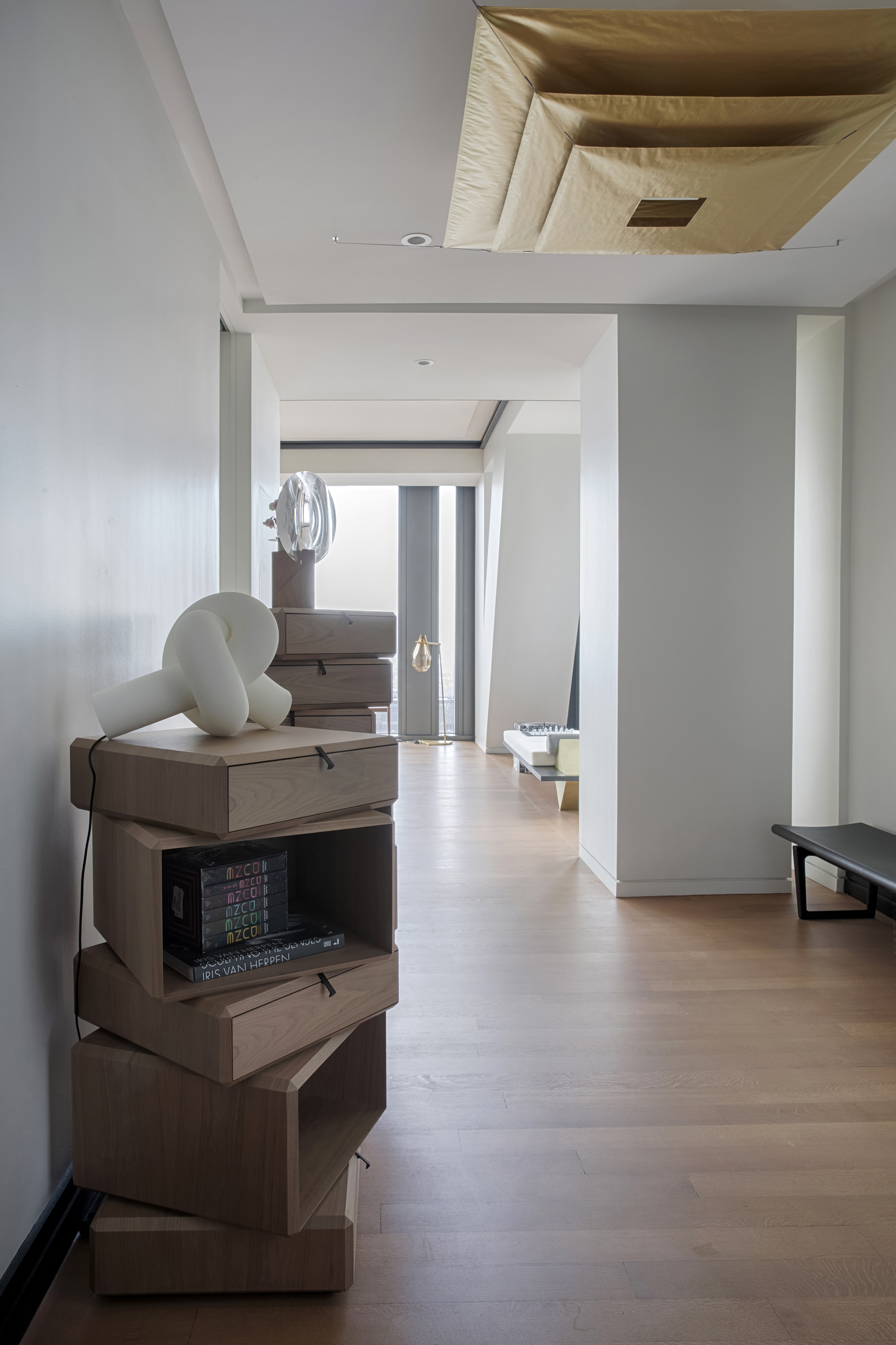 A composition from the Pass-word system by Dante Bonuccelli enriches the TV area, balancing solid volumes with open voids to encourage expressive freedom and modularity. Teorema by Ron Gilad, featured in the entryway and bedrooms, continues the theme of micro-architecture — celebrating asymmetry, rhythm, and fine joinery in an American walnut finish.
