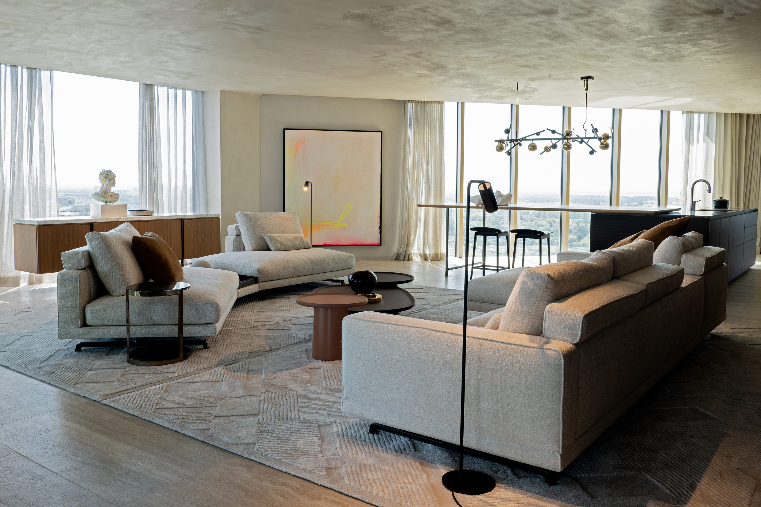 The Molteni&C|Dada experience continues on the 26th floor. A magnificent Penthouse with a great view over the city provides the background to the GREEN gastrobar of the celebrated chef Peter Lute. Two spacious lounges invite guests to make themselves comfortable after lunch or for a drink at sundown in front of the wide windows: on one side a pair of Lucas sofas creates a specular lounge, next to the Walter armchairs designed by Vincent Van Duysen. On the opposite side of the floor the Gregor sofa creates a conversation corner complete with the Kensington armchair, designed by Rodolfo Dordoni.