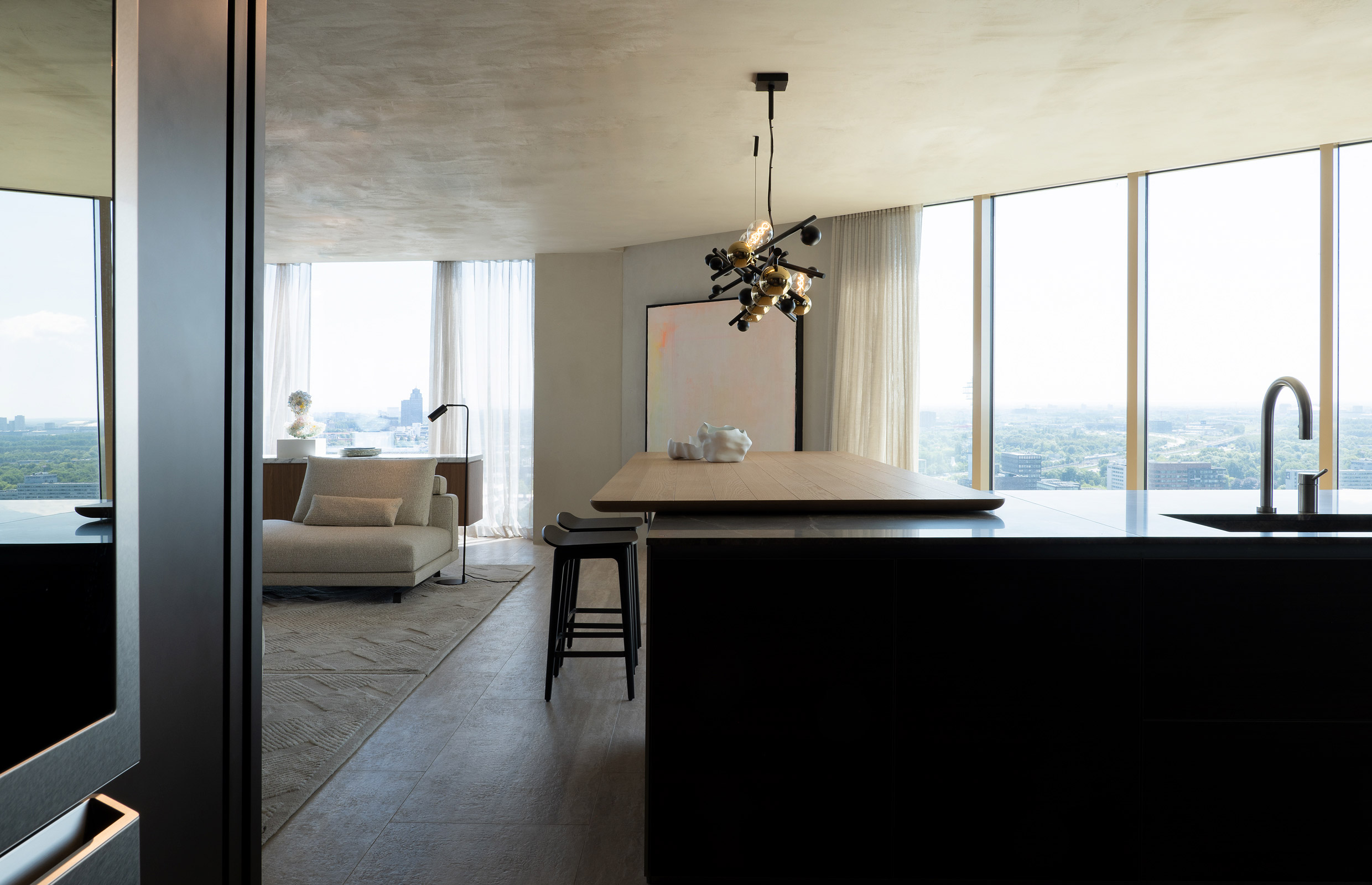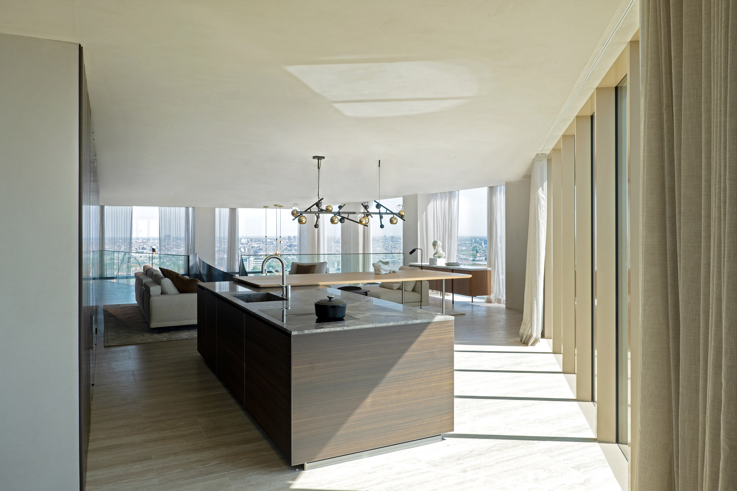 To reach the private lift that goes up to the penthouse on the 26th floor, the pathway passes through a refined area dedicated to the kitchen featuring Intersection, the peninsular of which is completed by Rodolfo Dordoni’s Devon chairs, just as Michael Anastassiades’ Half a Square table completes the exhibition pathway of the ground floor.