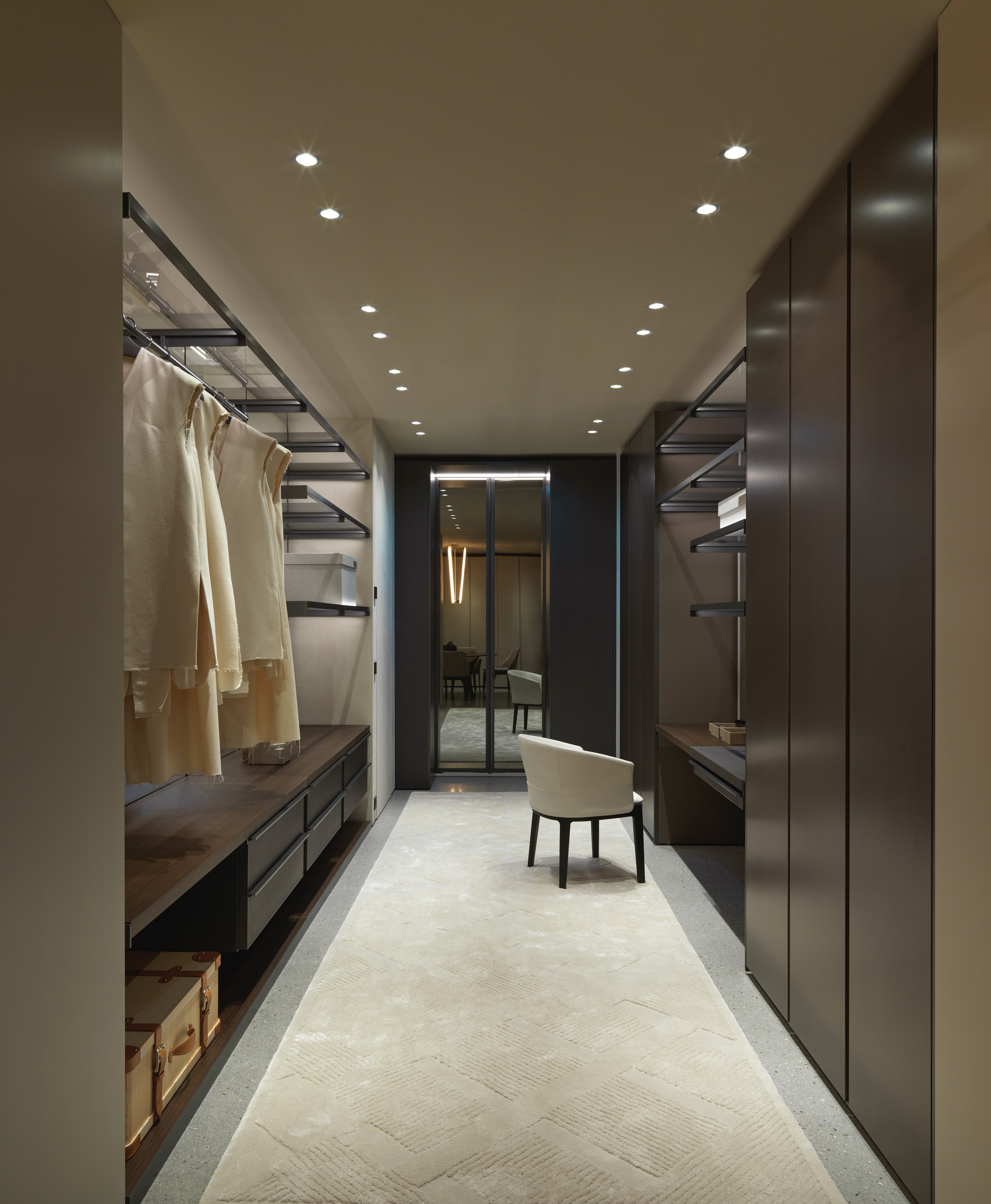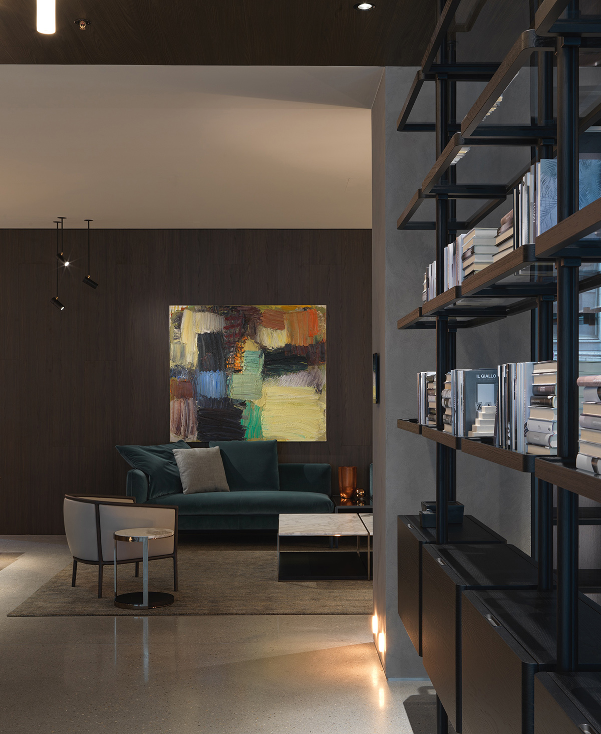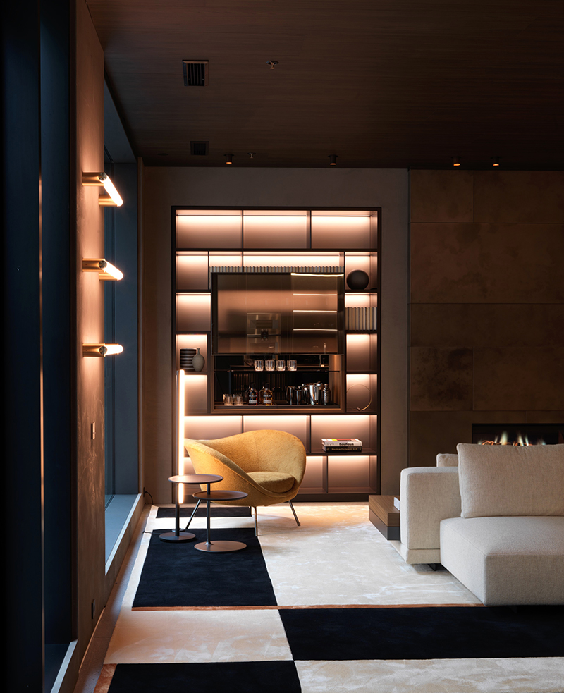 The visitor’s experience develops from a wide entrance that ensures perfect harmony between the living area and the kitchen. The fireplace contributes to creating a welcoming scenario, in which the Marteen sofa designed by Vincent Van Duysen, flanked by the small Vicino coffee tables and by Nicola Gallizia’s 505Up bookcase, is the protagonist. Last but not least, visitors can enjoy re-editions of Gio Ponti’s furniture, such as the iconic Round D.154.5 and D.154.2 armchairs along with the D.552.2. coffee table.