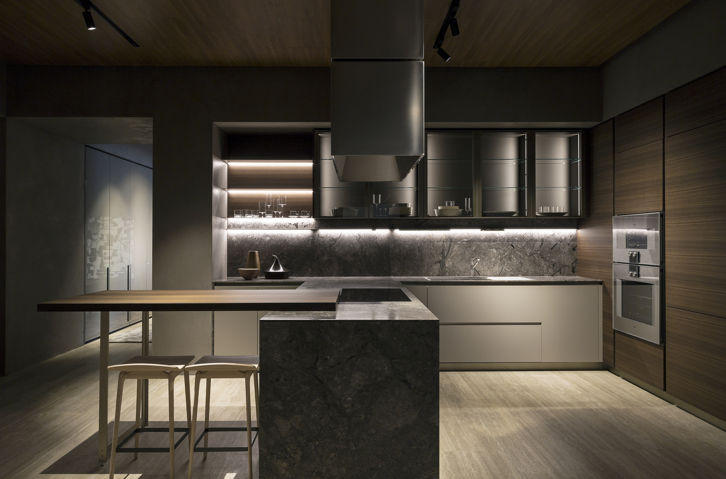 The flooring is enhanced by the soft colour of the travertine stone, giving the spaces throughout the store a natural light. Suspended wooden ceilings alternate throughout.