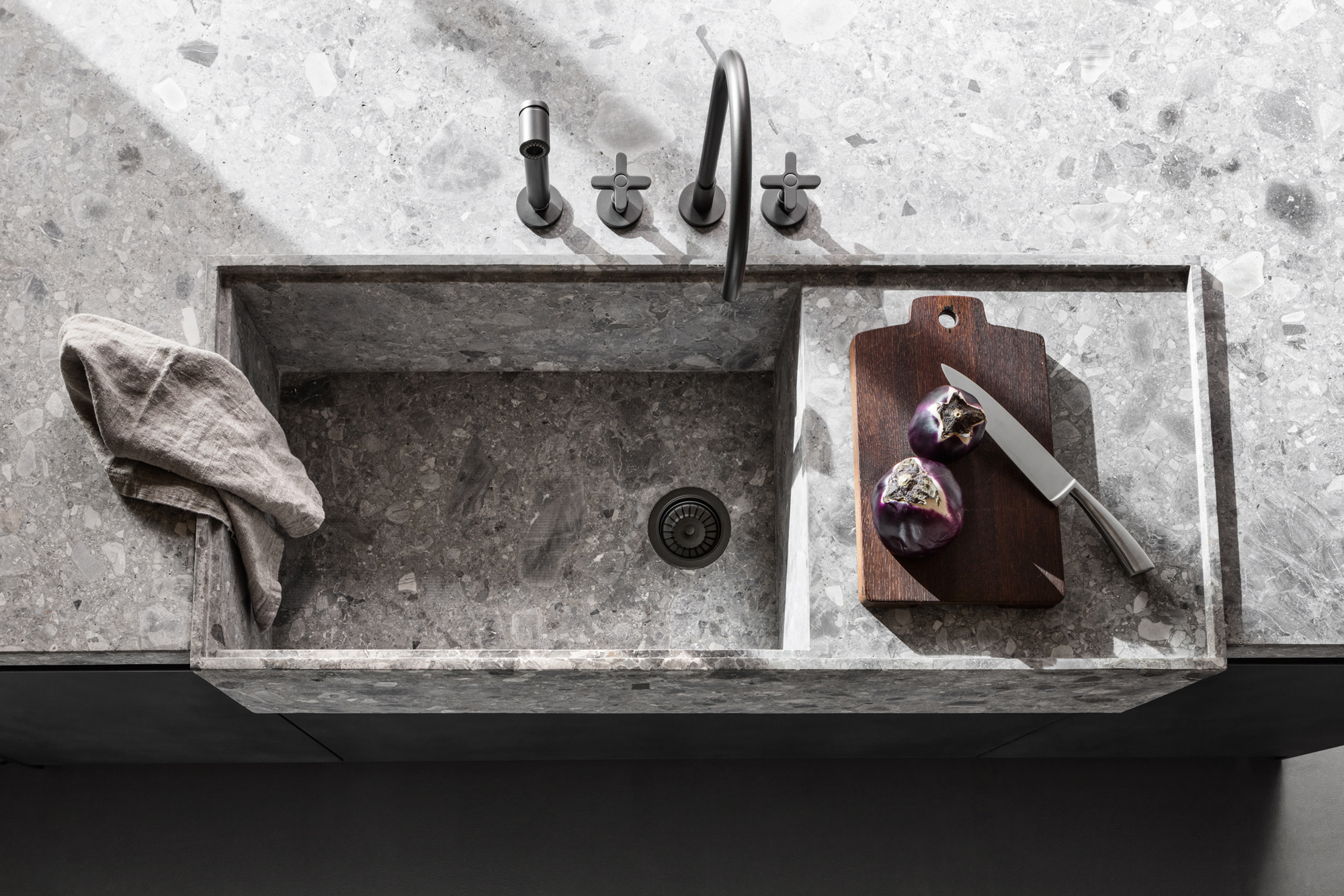 With VVD, Vincent Van Duysen reinterprets the recessed handle detail in a modern and sophisticated key, working on the contrast between the slim side and end units and the considerable thickness of the worktops, which fit in, interrupting the linearity of the worktop, with stone sink bowls. The alternating materials and the interplay of solids and voids give rise to a dynamic and at once sophisticated kitchen.