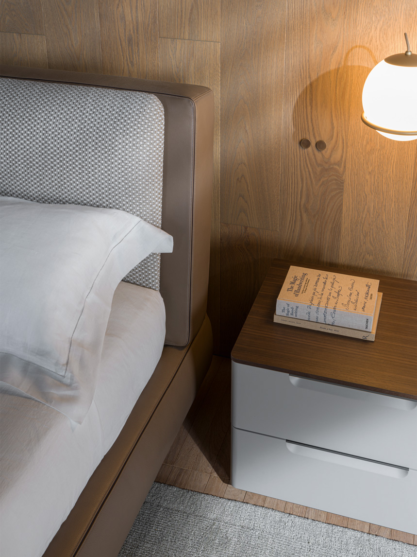 Rodolfo Dordoni has designed a complete set, where fine materials and finishes combine with a sober and elegant design for new functional aesthetic solutions. Both units, bedside table and drawers feature a front with rounded corners, which lightens the structure. The drawers in the chest of drawers and the bedside tables are lacquered in the colors of the Molteni&C range and are fitted with fine, recessed and easy-to-grip pewter handles. One novel feature is the superimposed tray-cum drawer, again made of eucalyptus wood, complete with a transparent ribbed glass top. As an alternative, the bedside table and the chest of drawers can be enriched with a slim eucalyptus, colored matt lacquer or in marble top.