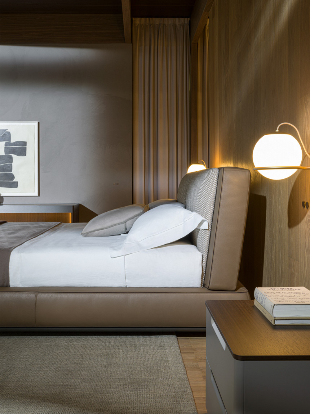 Designed as an isolated element, totally autonomous and self-sufficient, able to fit in with all kinds of bedroom furniture, Aldgate presents carefully designed details and soft, delicate and snug lines. Its heart is a container with rounded edges, unholstered in textiles or in leather and with sartorial finishes, embellished by a surrounding pewter frame that incorporates the bed, which can be positioned at different heights, and the rectangular backrest that recalls a monumental access road to the city. That too is rounded and it features two comfy cushions to lean back on.