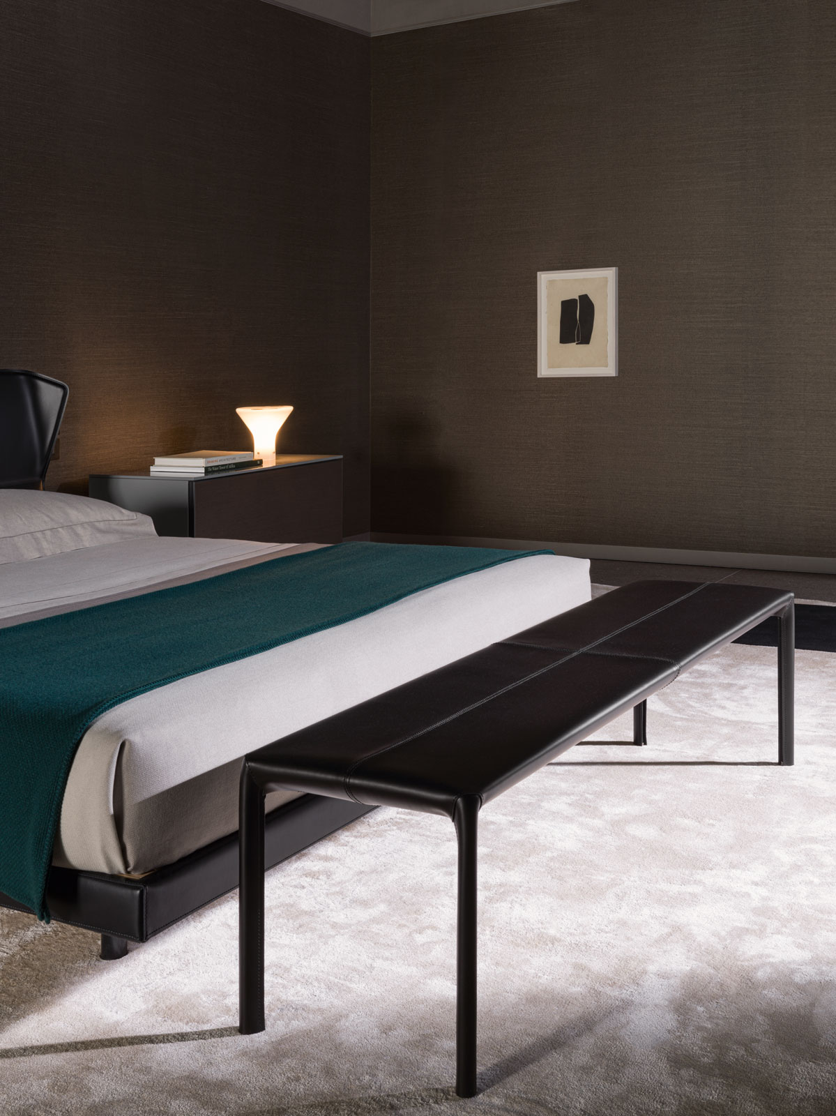 Powder coated steel structure completely covered in regenerated hide-leather in the colors of the Molteni&C range.