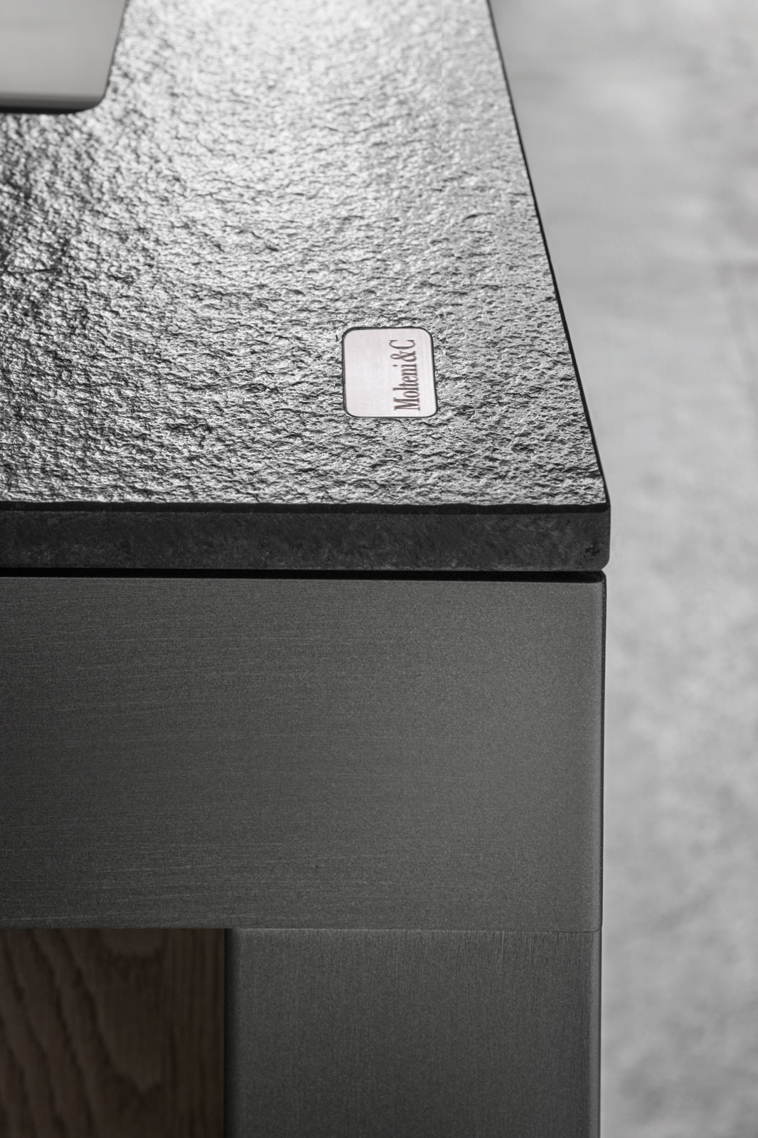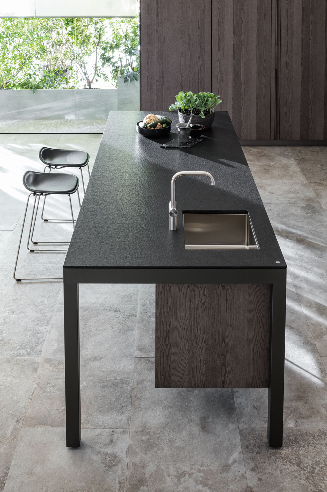 A solid extruded aluminium frame supports the thin line of the worktop that defines the horizontal side of the cabinets. The structure remains suspended in mid-air, and is completed by floor standing base units. The island structure supports the under-Banco base units. The worktop has a minimal thickness and sets into the aluminium structure, hiding its solid interior.