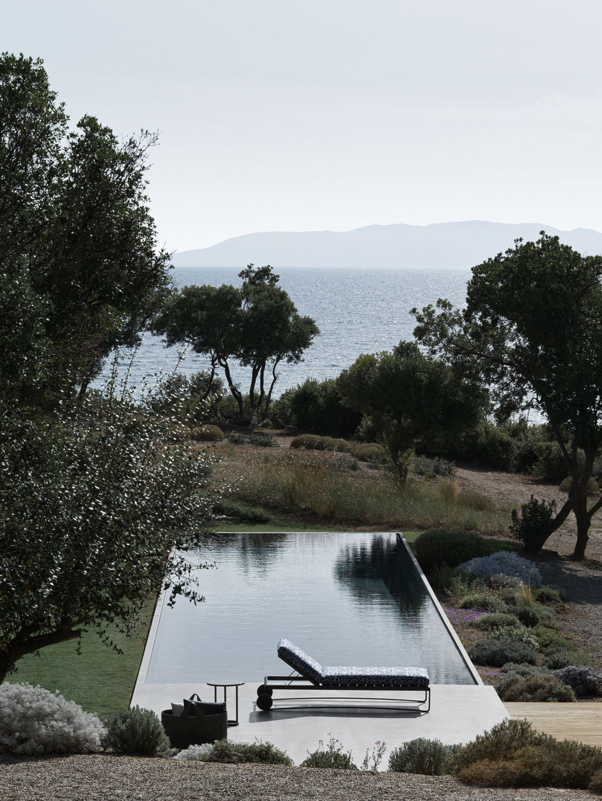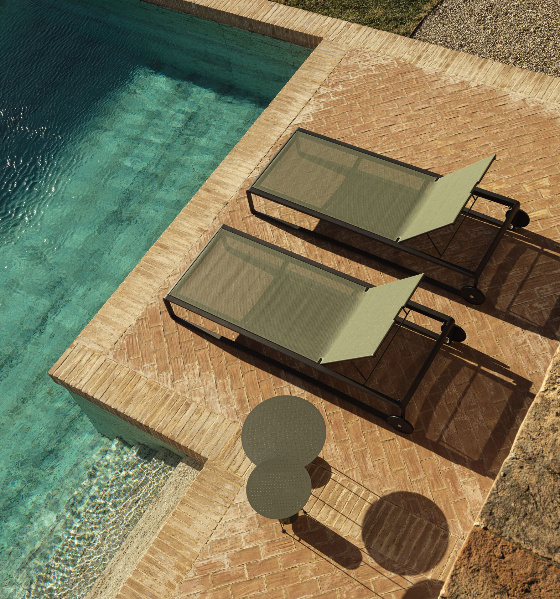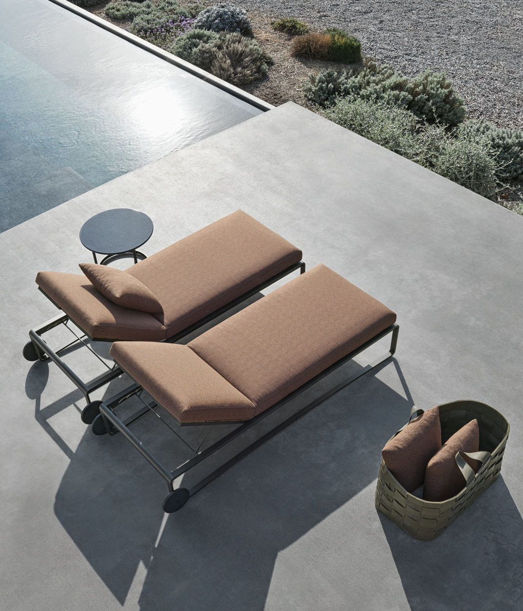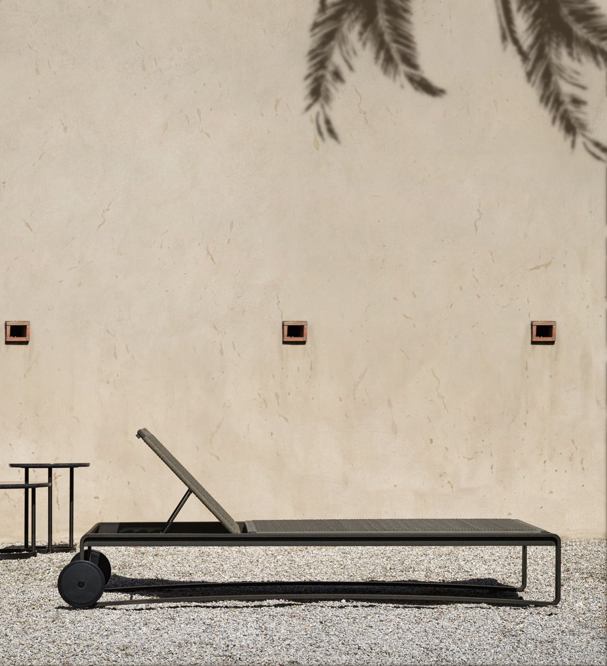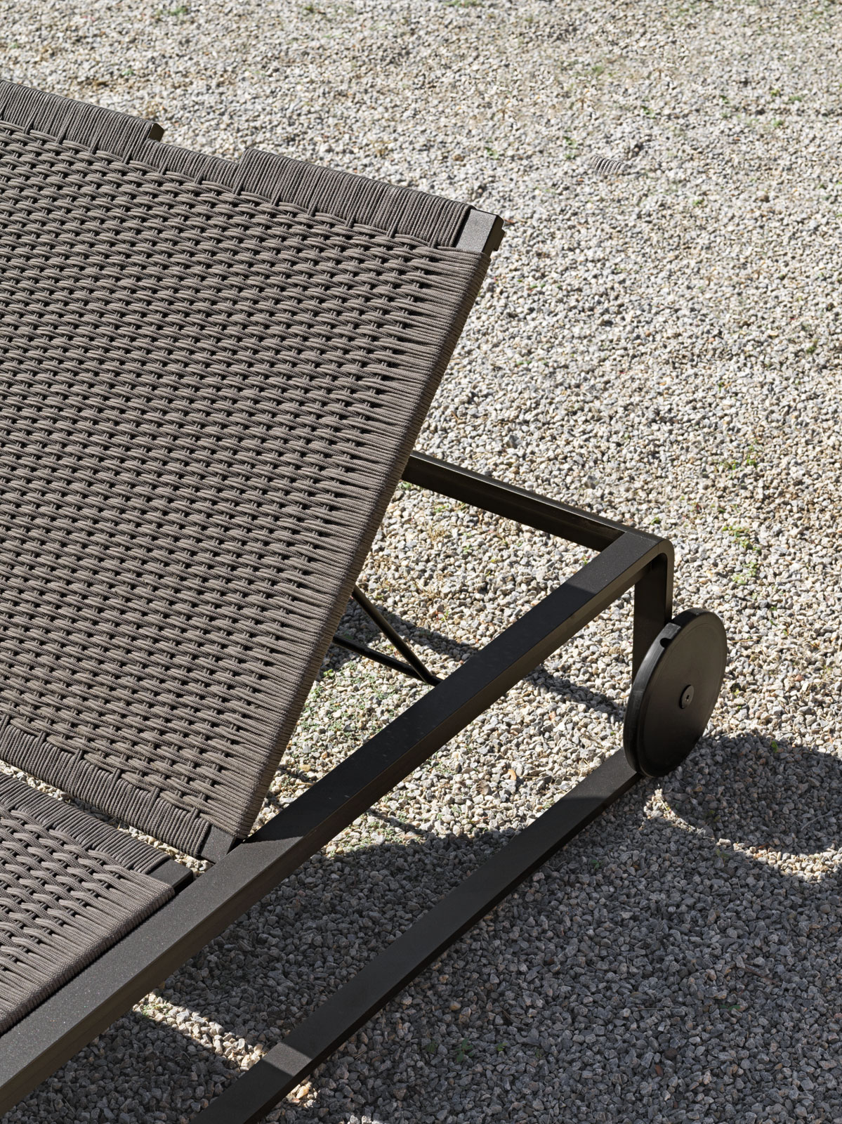 The sunbed, the archetype par excellence of outdoor furniture, interprets all the elements that characterise the aesthetics of the Timeout Collection, re-proposing the theme of the burnished painted aluminium band, running along the entire profile, and the traditional motif of the polypropylene rope weave.