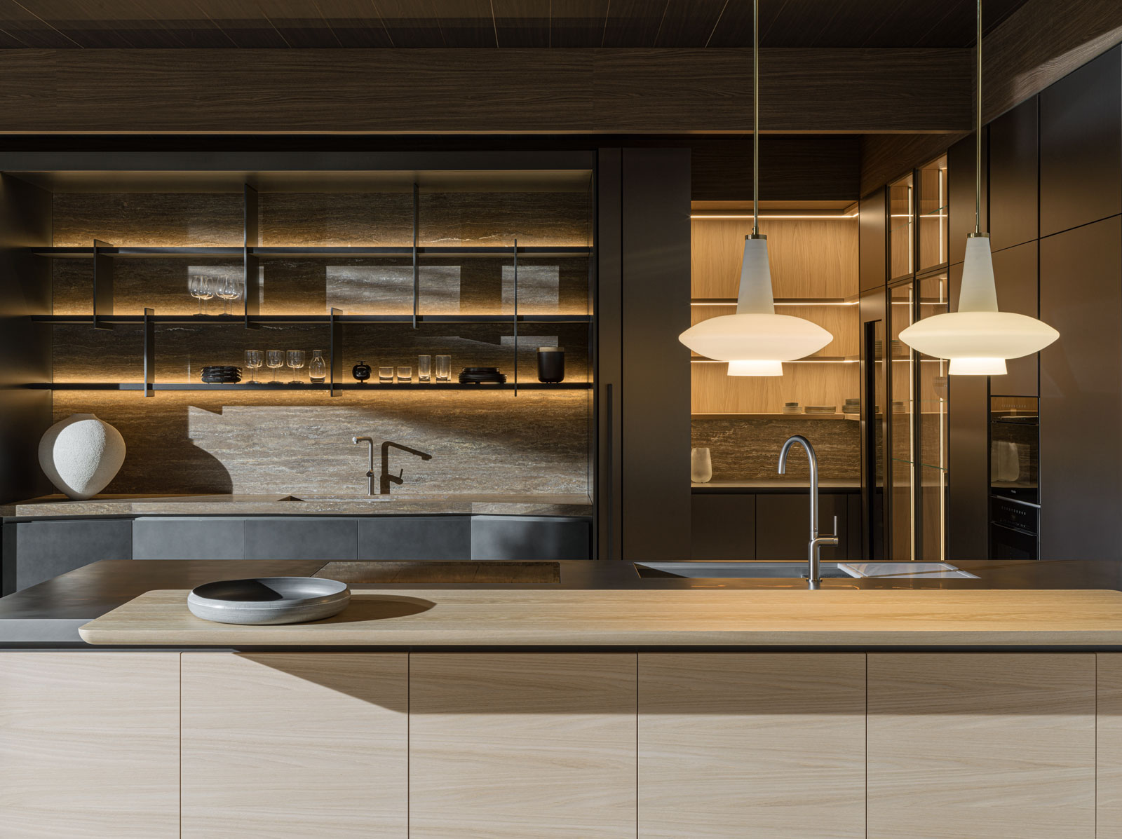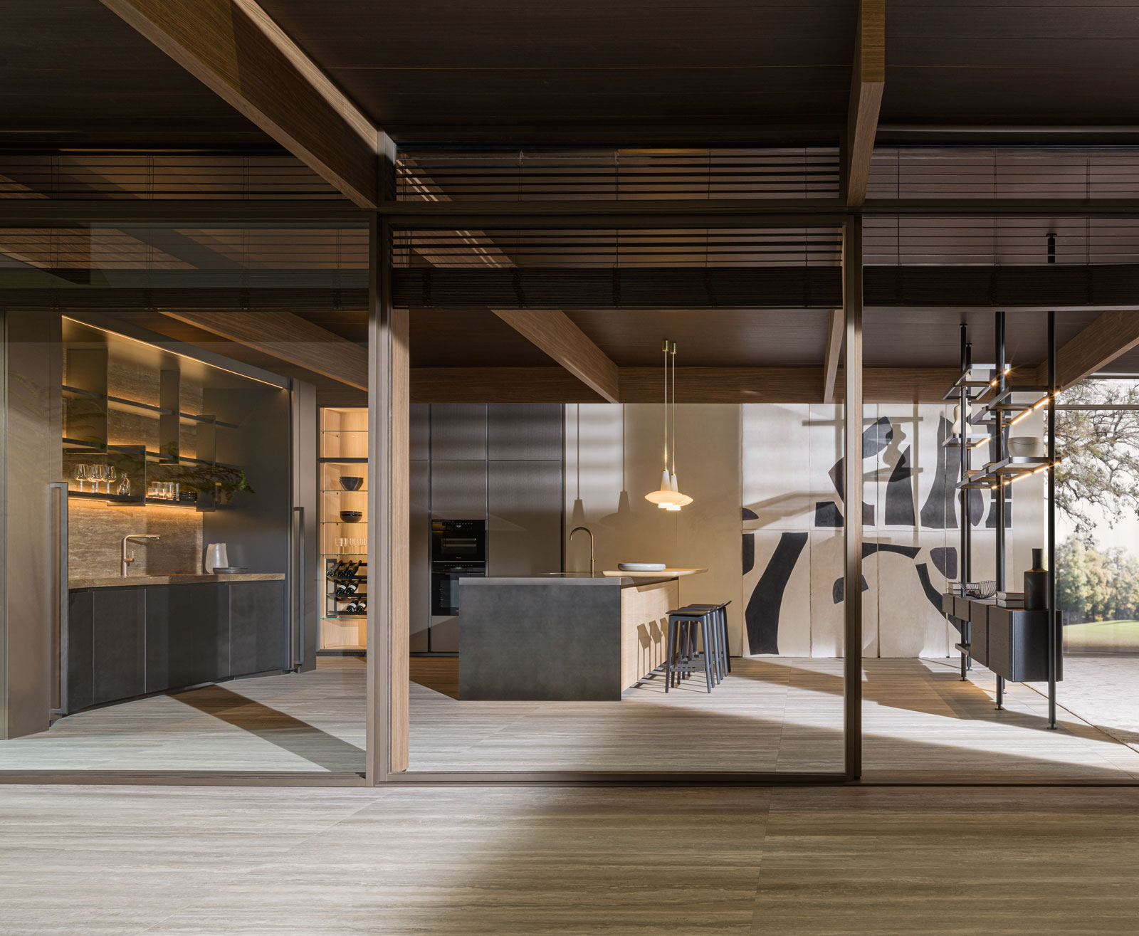 A unitary project, simple and linear: Hi-Line 6 is more than just a kitchen. It's a space to live in. This space is organised with "esprit de géométrie" combined with rigorous shapes, richness of detail and care for quality in construction. The base units are taller, to hold more and better. Far from the classic concept of the kitchen, Hi-Line 6 allows for several composition options. No handles are used – instead there is a finger recess to open and close the doors.