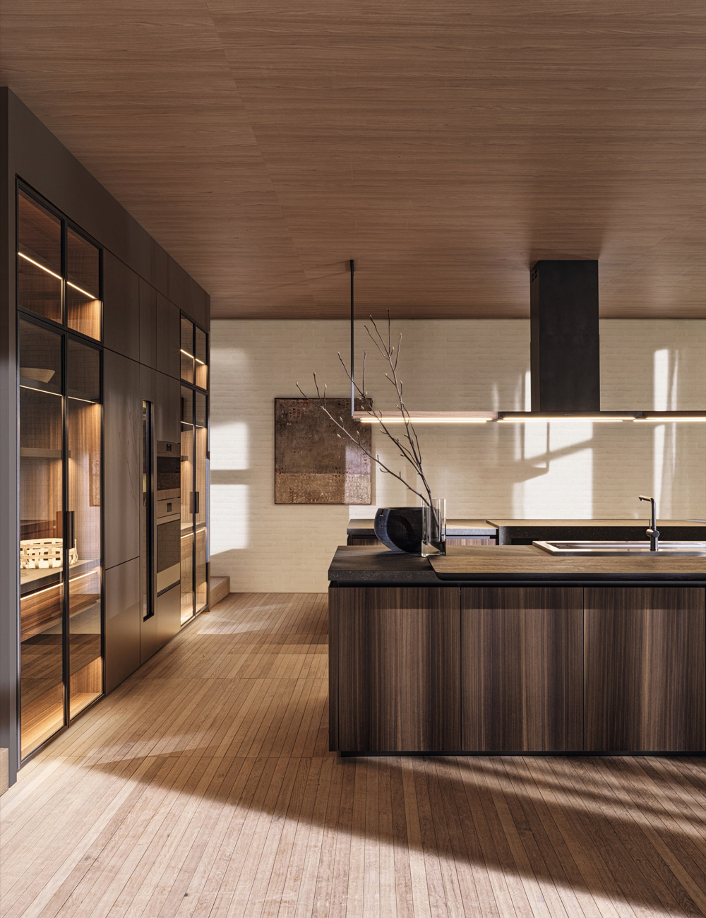 The composition is completed with the new system of shelves with built-in VVD hood and with the new Hi-Line6 snack bar, with its solid light oak and black oak top, featuring bevelled corners and profiles, on a titan and pewter aluminium frame. Precious materials such as eucalyptus for the island base units, with pewter aluminum framed doors, and steel for the top with integrated sink and hob.