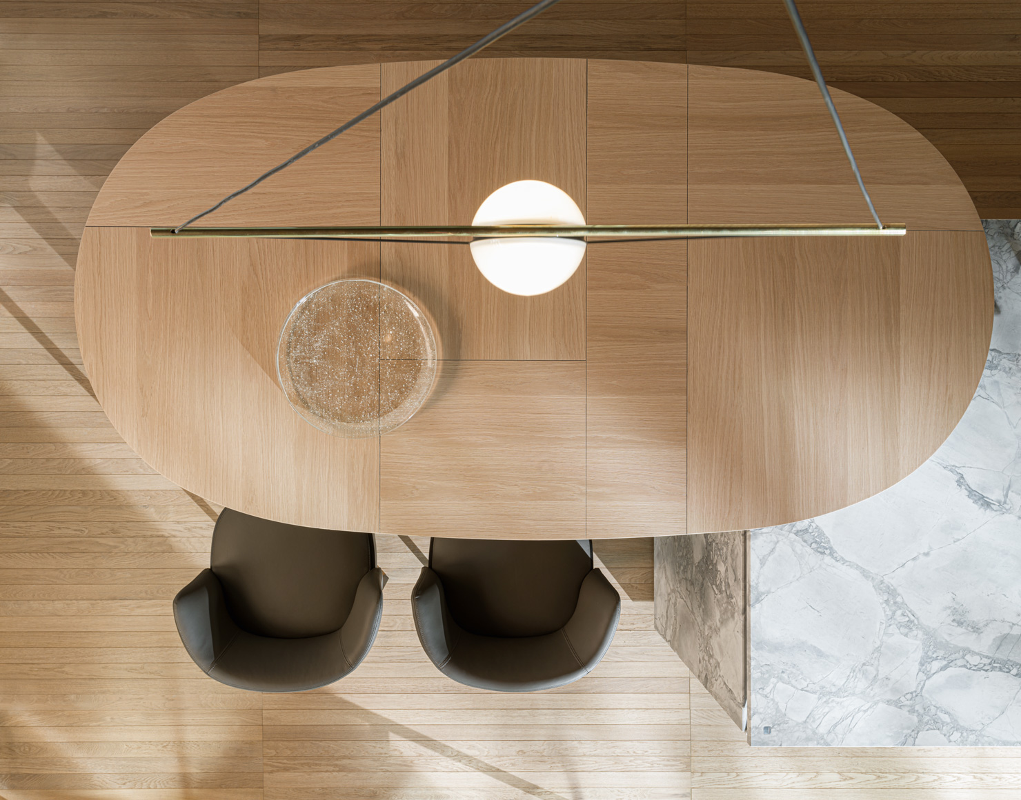 Geometric inlays on the doors highlight the wood’s natural features and showcase the plasticity of lacquered surfaces, with a design that recalls architecture dominated by geometric proportions.