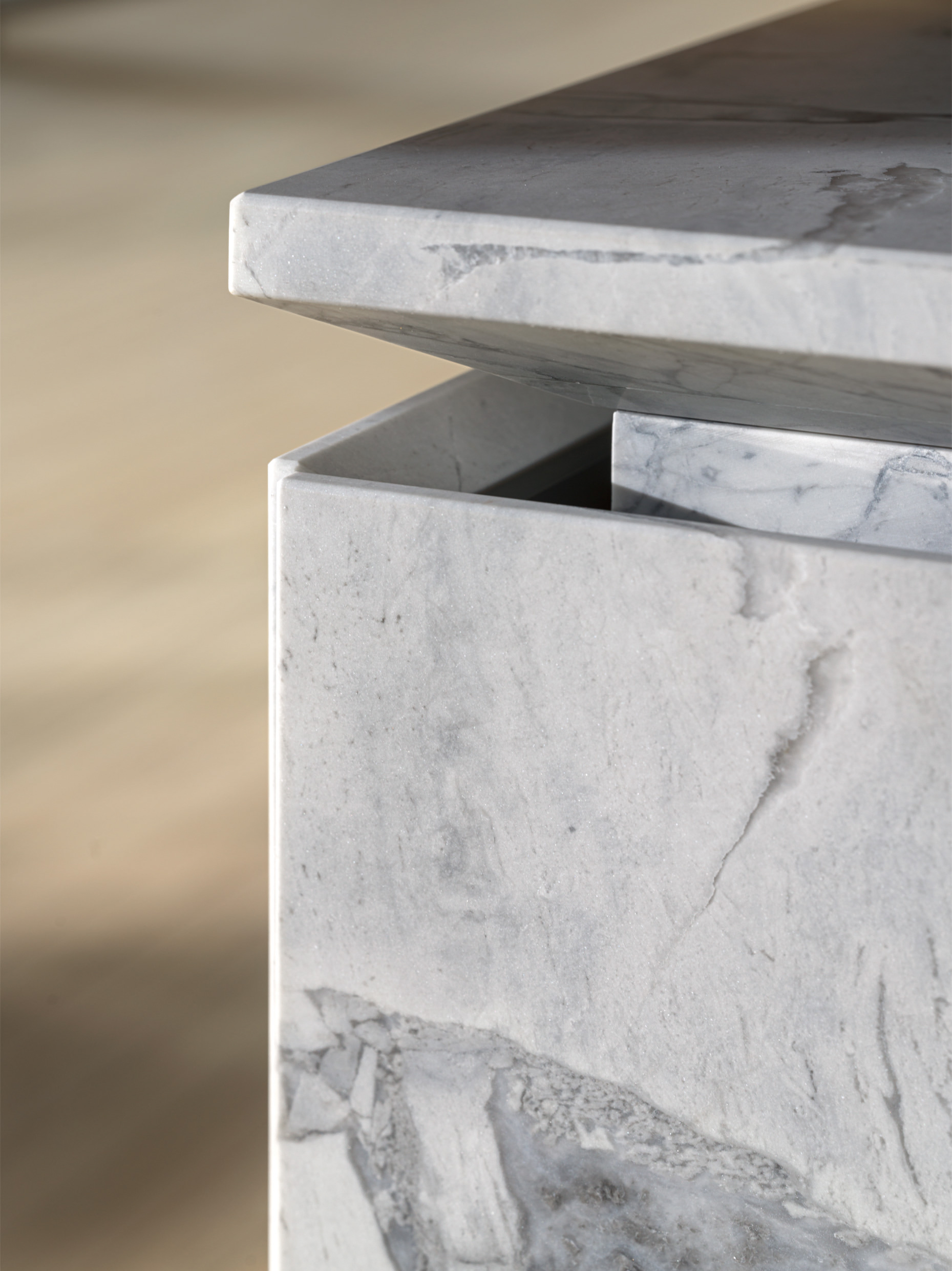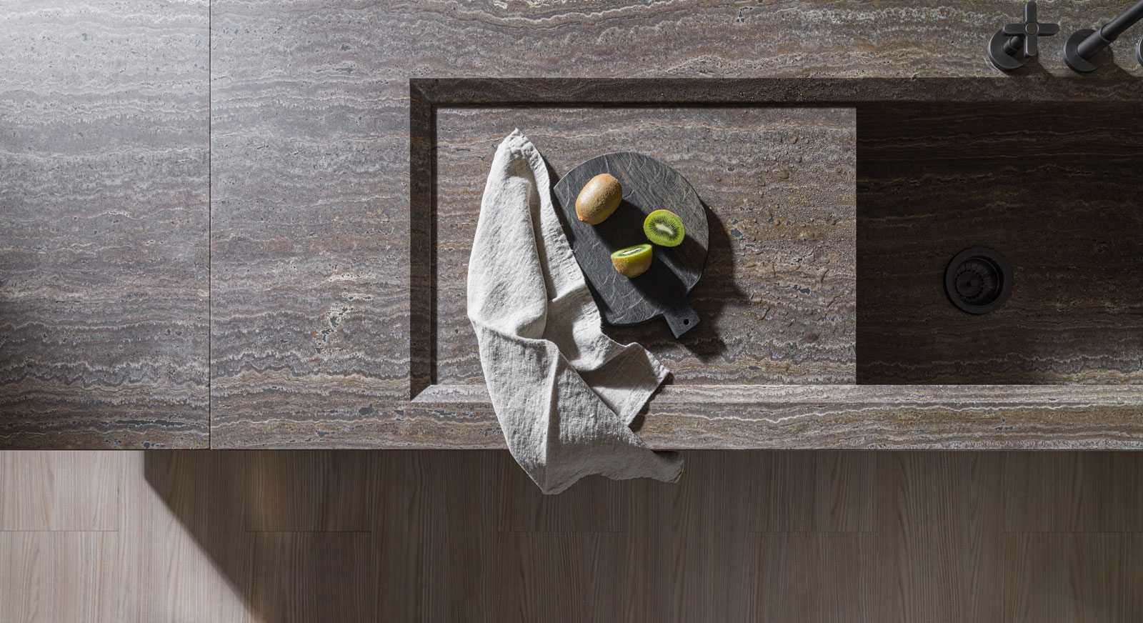 Firstly, this project implies choosing a material that fits the purpose, natural stone, with the unique characteristics that Nature bestows, and secondly, using innovative technologies to achieve it, as is deducible from the doors of the bases, which open effortlessly to guarantee the utmost functionality. The natural stone slabs are machined and excavated with high precision mechanical processes, so as to lighten the panels and guarantee them for domestic use.