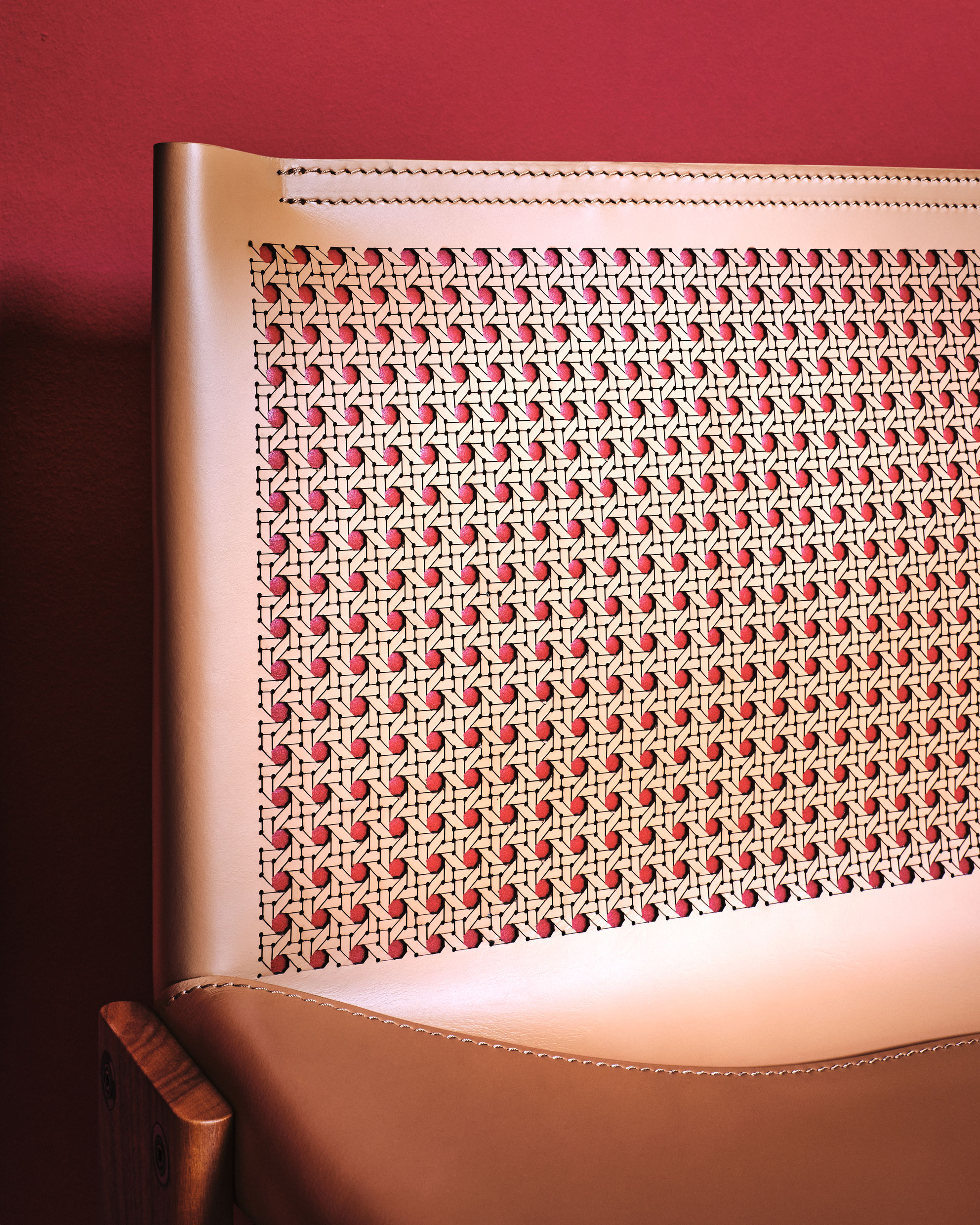 The motif reveals a contrasting red panel behind it for visual depth and a vibrant finish. The Monk armchair x Cabana is available in a limited edition.