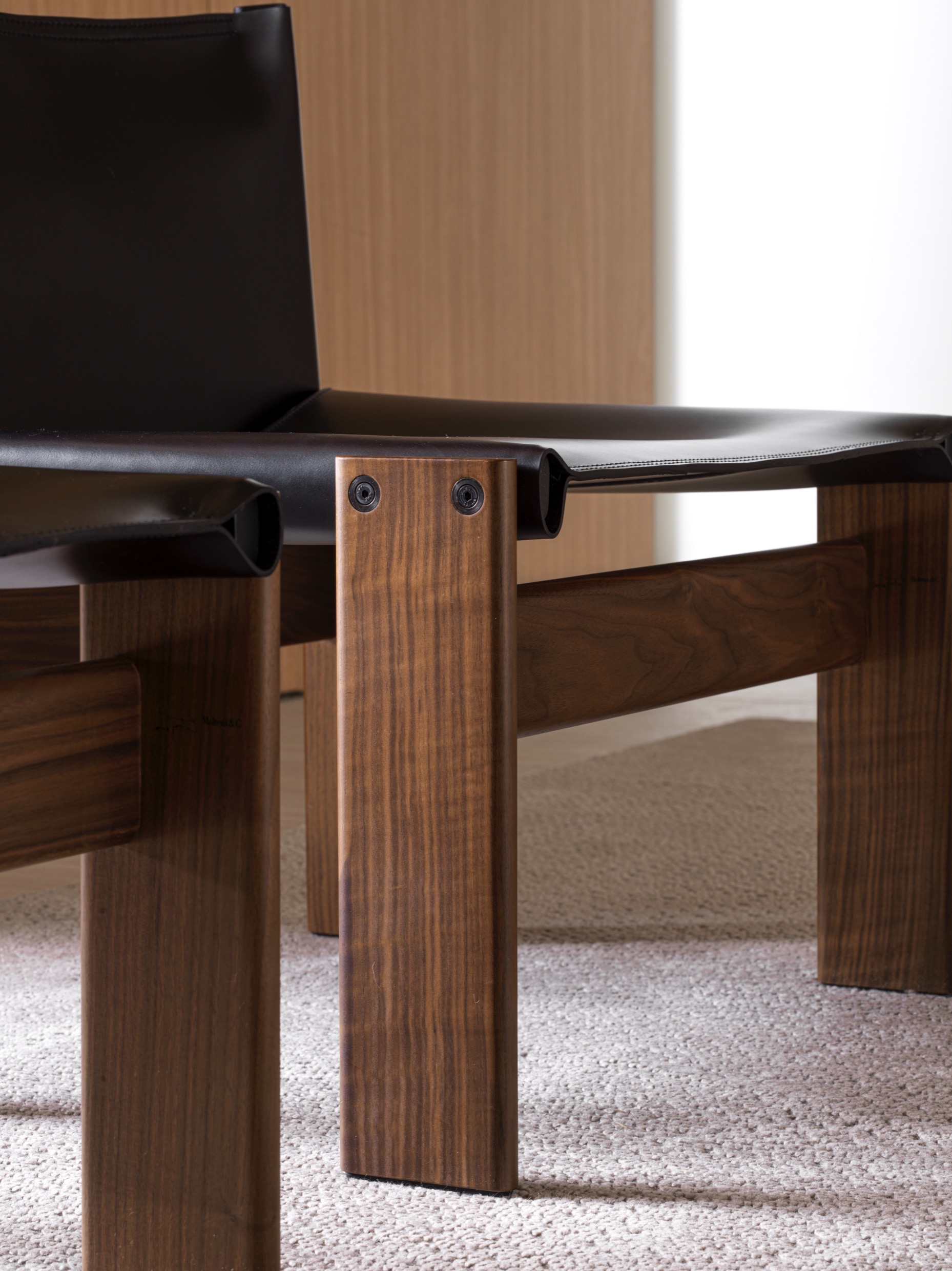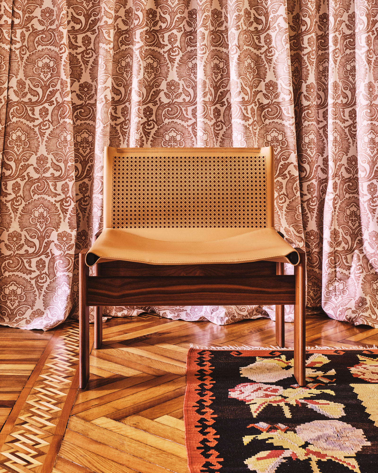 An exclusive reinterpretation of the Monk armchair created in collaboration with Cabana brings a distinctive flourish to the modernist design. The armchair’s American walnut frame supports a natural hide leather backrest that features a Cabana-designed, laser-cut motif inspired by Viennese cane weaving.