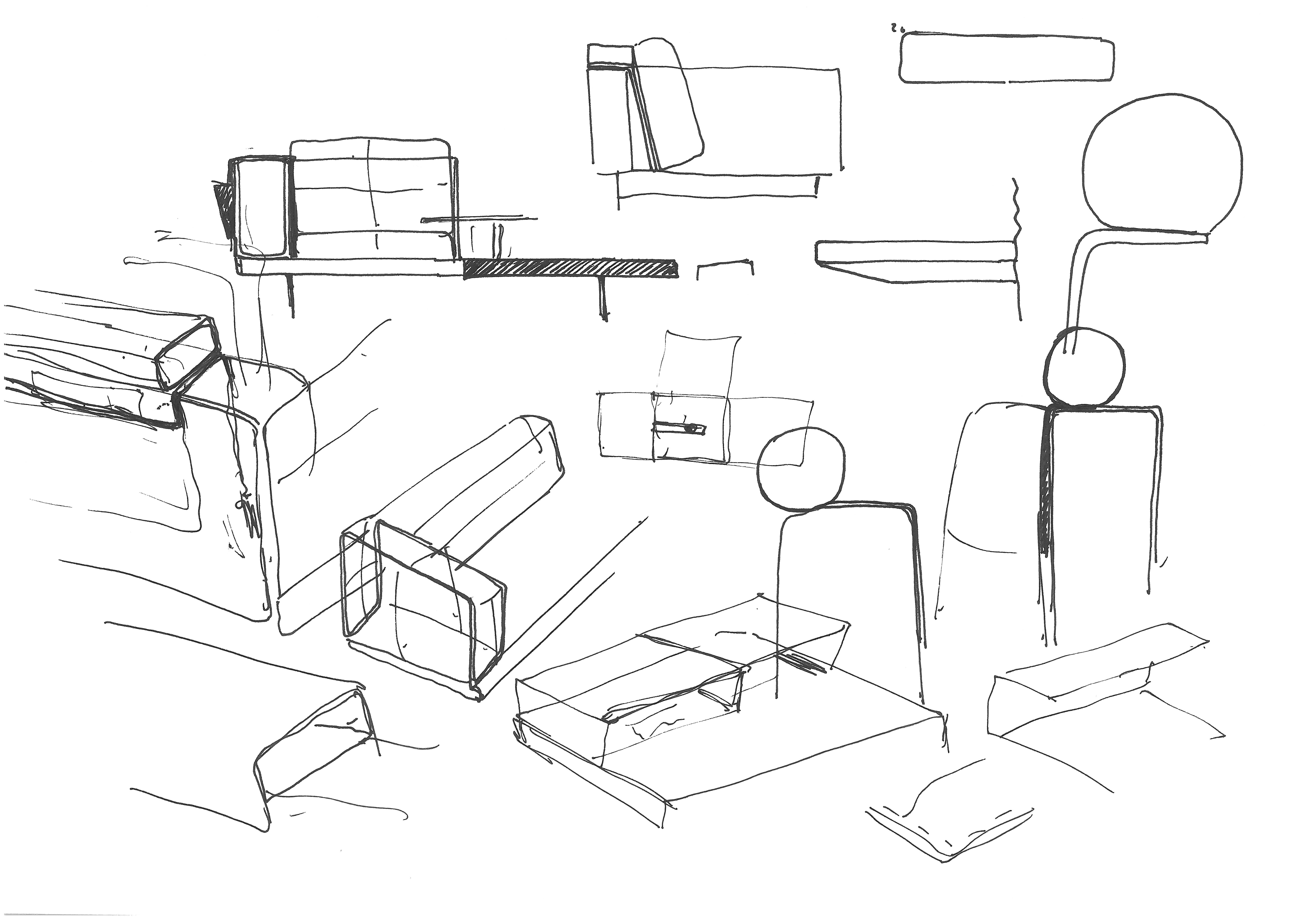 Blade-like extruded steel legs support the base on which rest low rectangular textile or leather upholstered backrests, of the same thickness as the cosy seat cushions.