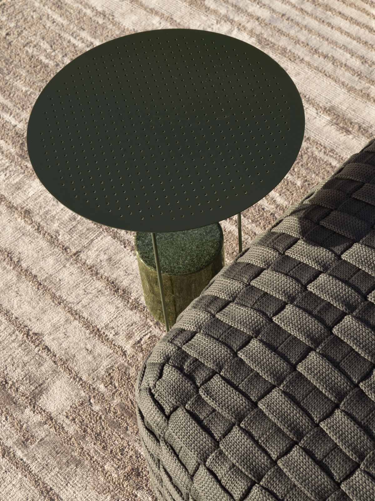 The pattern recalls the shadows cast by the leaves of palm trees and their natural geometry. Ideal for both indoor and outdoor use, Palma establishes a pledge of responsibility and sustainability towards nature.