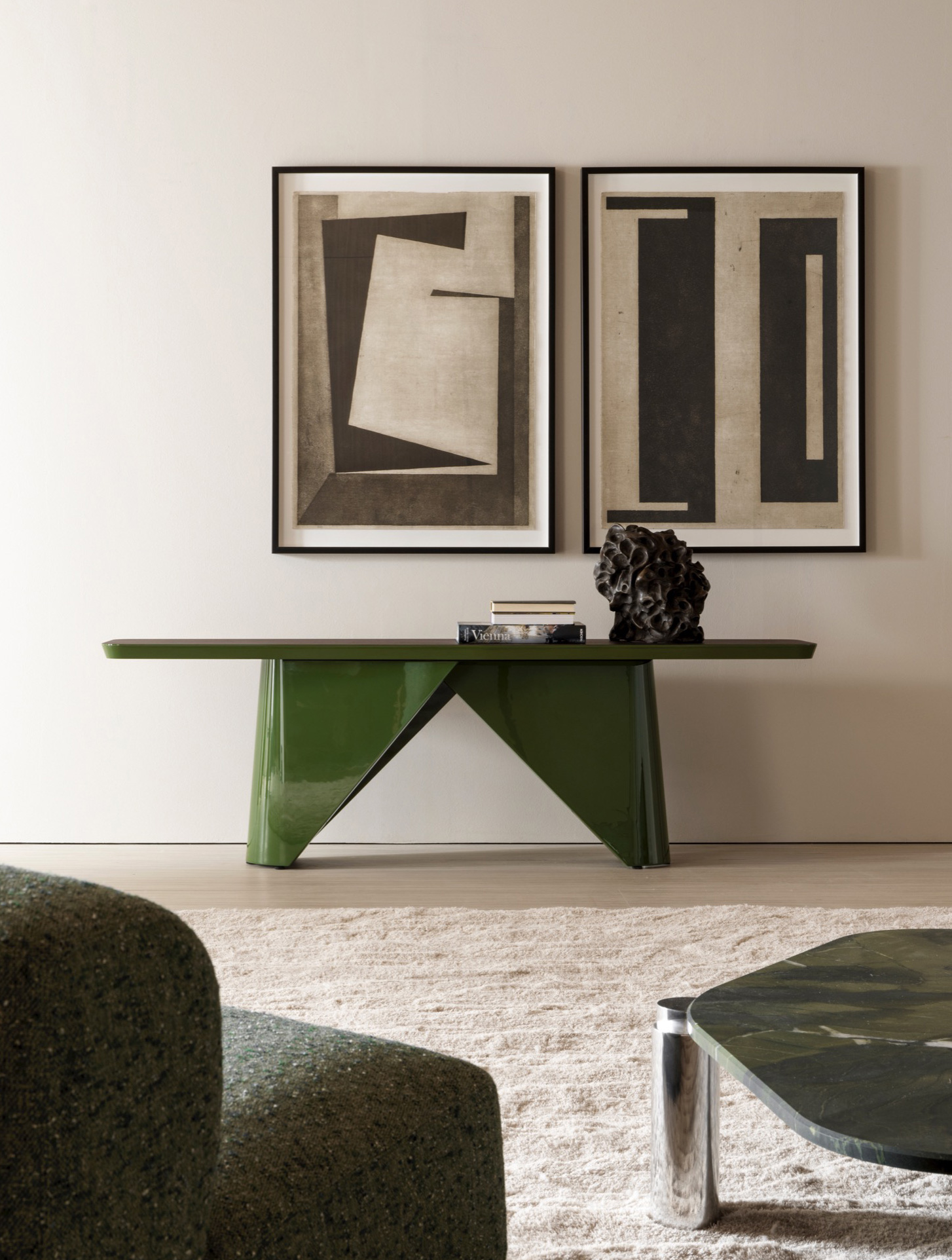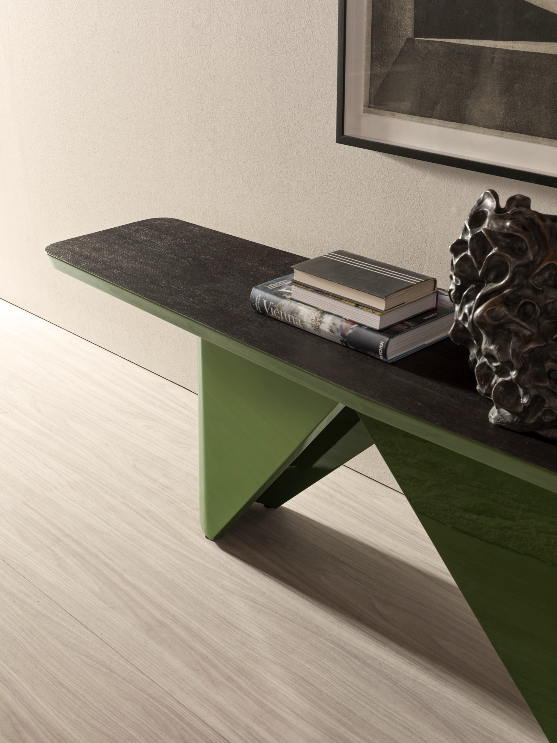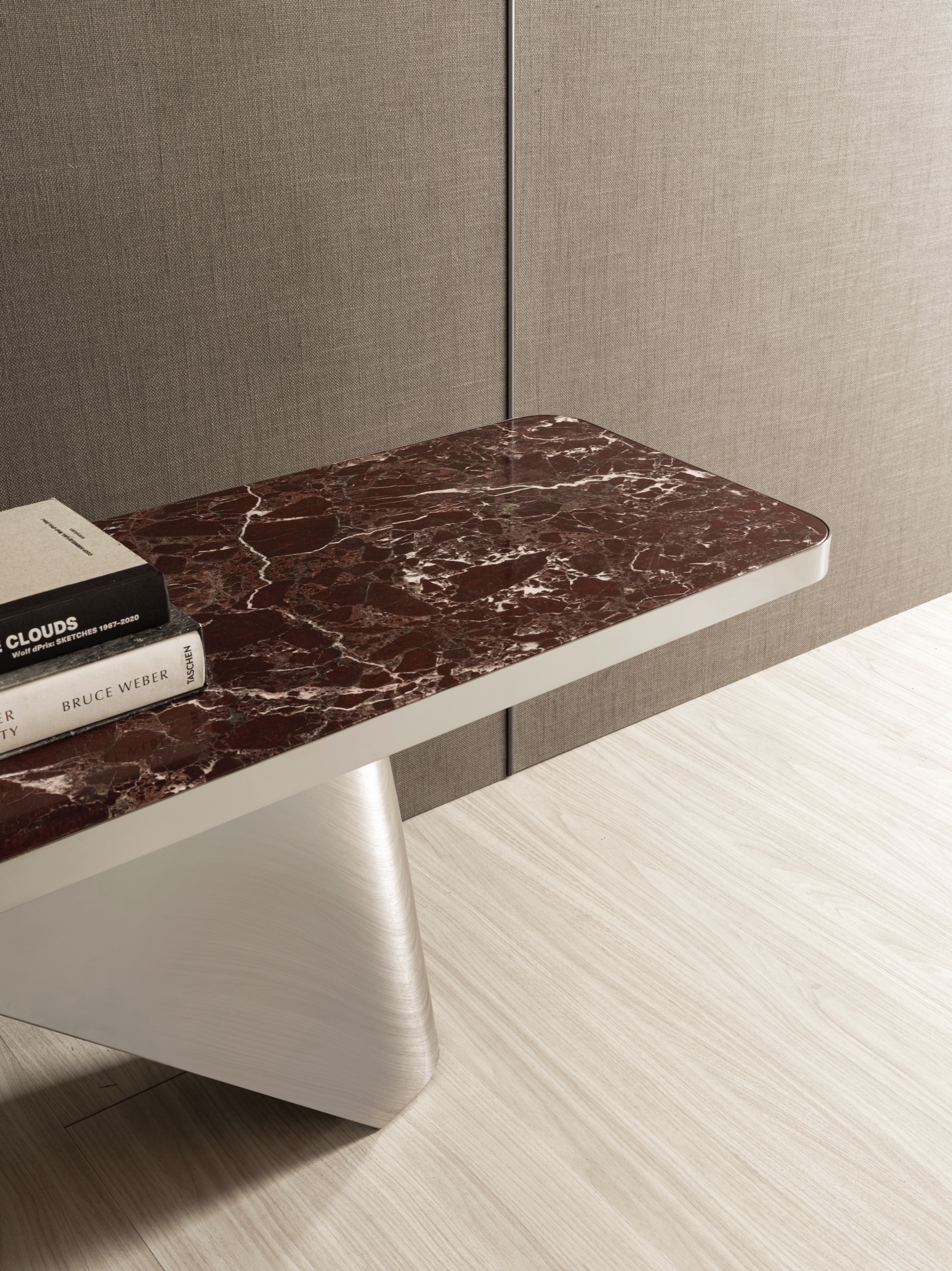 The consistency of the edge finish, echoed in the base’s glossy lacquer or polished steel, ensures a strong visual continuity throughout the piece. Whether placed against a wall or in the center of a room, Pénélope makes a striking statement, embodying sophistication and artistic integrity.